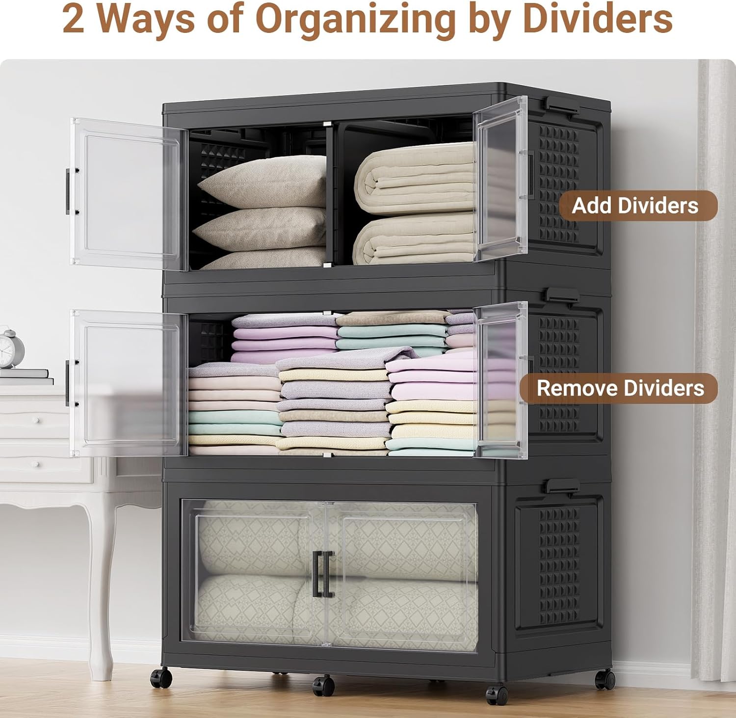 - 【Extra-Large Stackable Storage Bins with Dividers】BROVIEW storage bins offer an astonishing capacity of 200Qt/50Gal per tier. 1Pack foldable storage bin, equipped with clear doors and wheels, expands to generous dimensions of 33.5"L x 19"W x 19.5"H, can support a maxi weight of 120lb. Each tier is designed with a divider (can be removed, removed it will reduce load-bearing capacity), you can create two distinct compartments within a single level for organized storage. (Note: 1 Set ONLY 1 LID!)