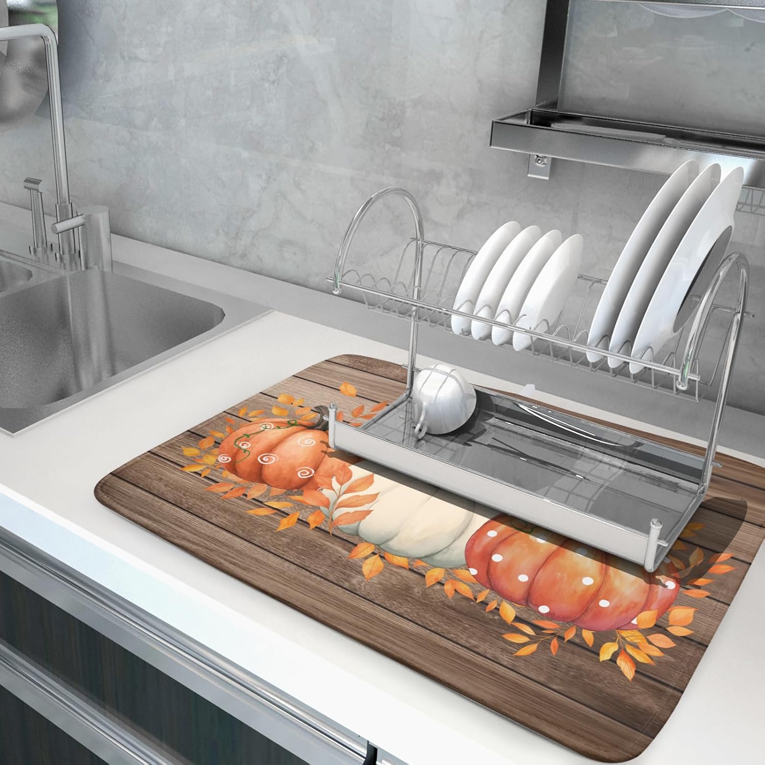 Autumn Pumpkin Dish Drying Mat Rustic Wood Dish Drainer Mats Fast Dry Microfiber Reversible Dish Drying Pad Kitchen Decoration 18x24 inch
