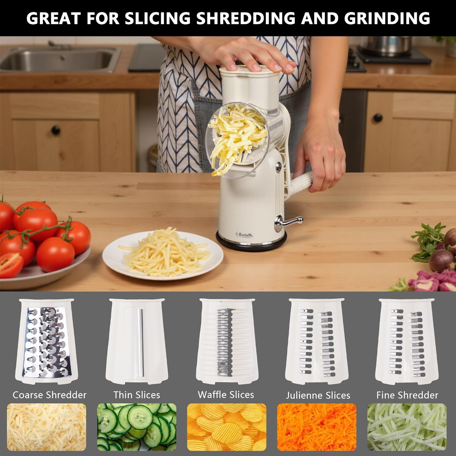 - 【Stable Suction Base for Effortless Shredding】This 5-in-1 rotary cheese grater and slicer speeds up prep by up to 18 times. Its strong suction base locks securely onto smooth surfaces, preventing slips for safe, stable use. With 5 interchangeable blades, you can slice, shred, or cut wavy textures without knife skills. Just turn the handle to prep cheese, potatoes, carrots, zucchini, chocolate, and more—quickly, safely, and mess-free. Perfect for effortless, everyday cooking.