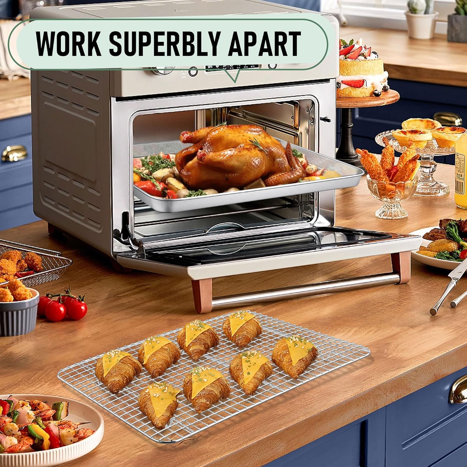 - Exquisite crafted, grid rack perfectly fits in the baking pan and work well on most regular oven or toaster oven, have excellent heat conductivity for evenly baking, oven safe up to 450°F, smooth mirror finished surface to to minimize the risk of food sticking, offer quick food release and easy cleaning, dishwasher safe to save your labor and time