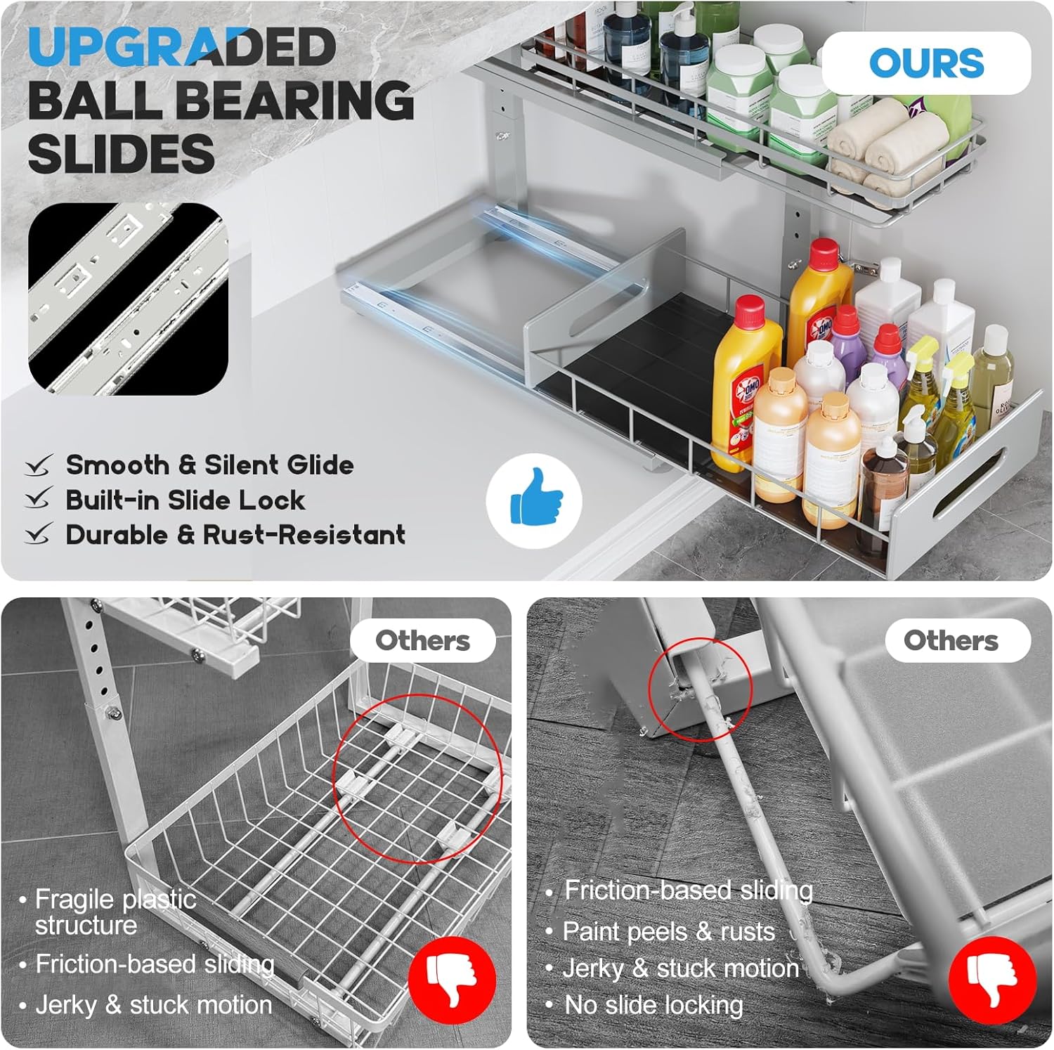 - 【Maximize Your Space】Dual-tier pull-out design offers ample storage for cleaning supplies, toiletries, and kitchen essentials—also perfect for organizing items on countertops.