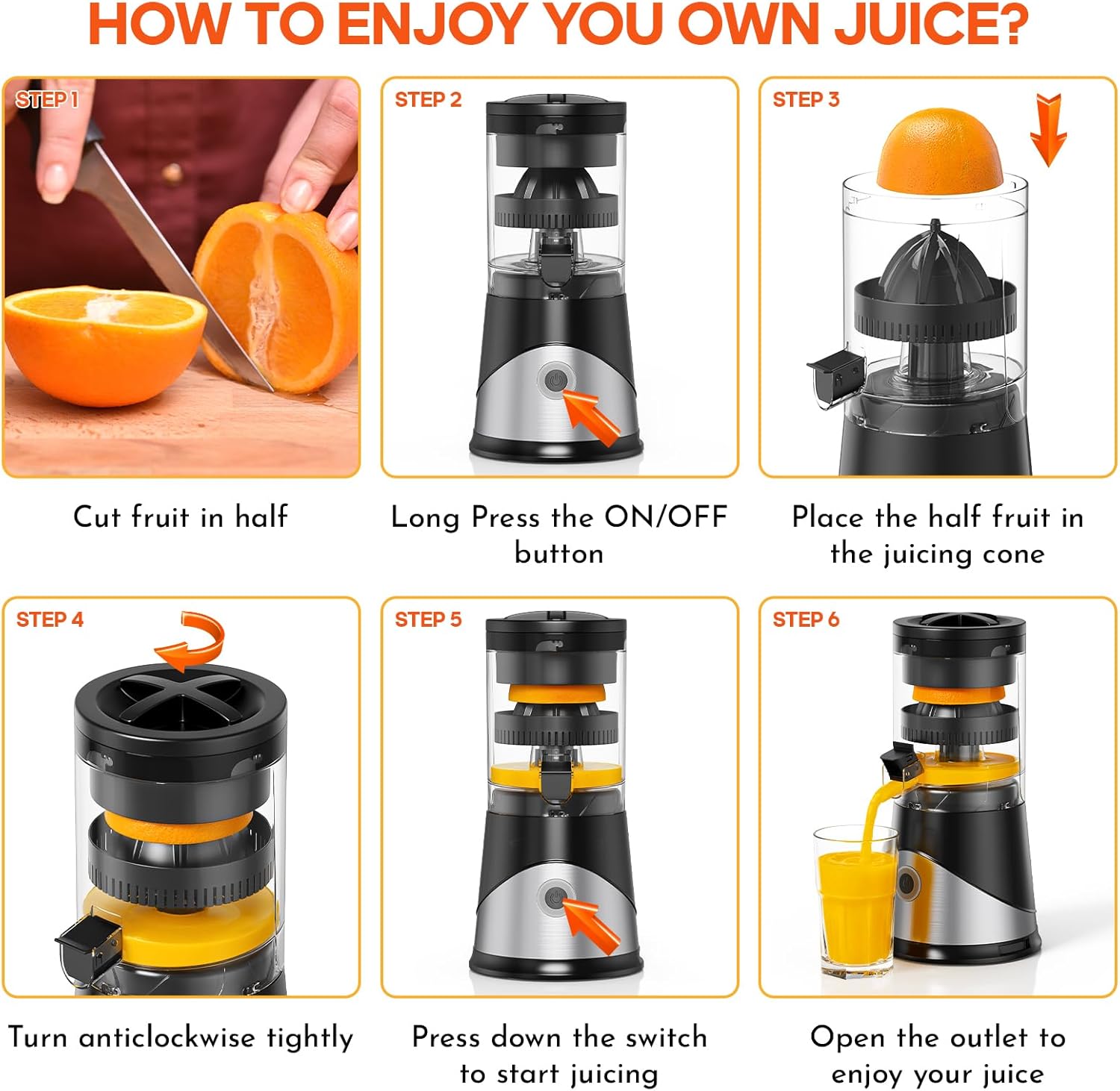- Powerful Juicing Technology: The electric citrus juicer with 70-watt motor powers, offers a quiet yet powerful juice, can create a cup of juice in 20 seconds. Ideal for oranges, lemons, and limes. Enjoy your time to gives your lovers and family fresh juice every day!