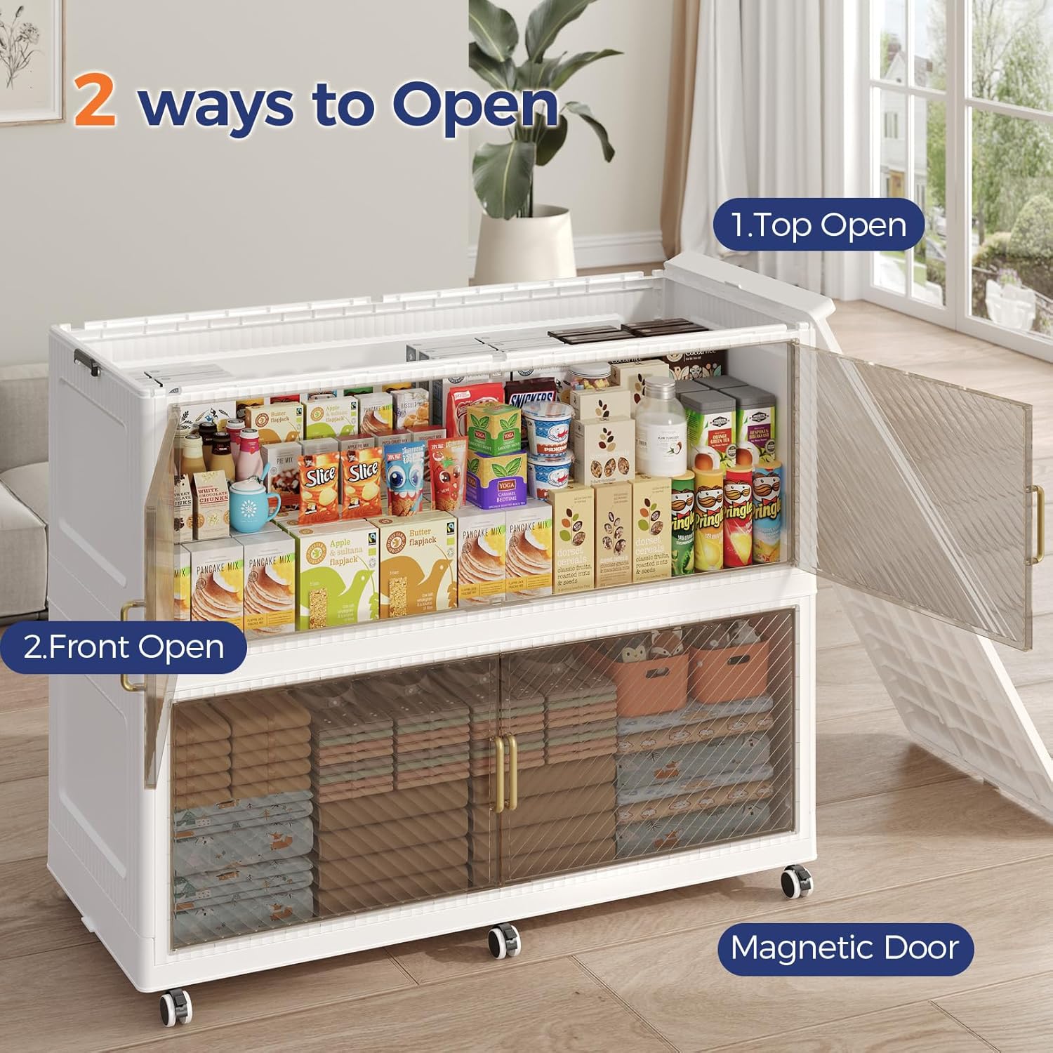 - 【Two Ways to Open & Magnetic Doors】The collapsible storage bins with lids and wheels feature a dual access way, allowing for both top and front door openings, and with clear brown windows for easy visibility. The super huge storage bins with open front doors are equipped with magnetic lock buckles to prevent dust from entering the cabinet.