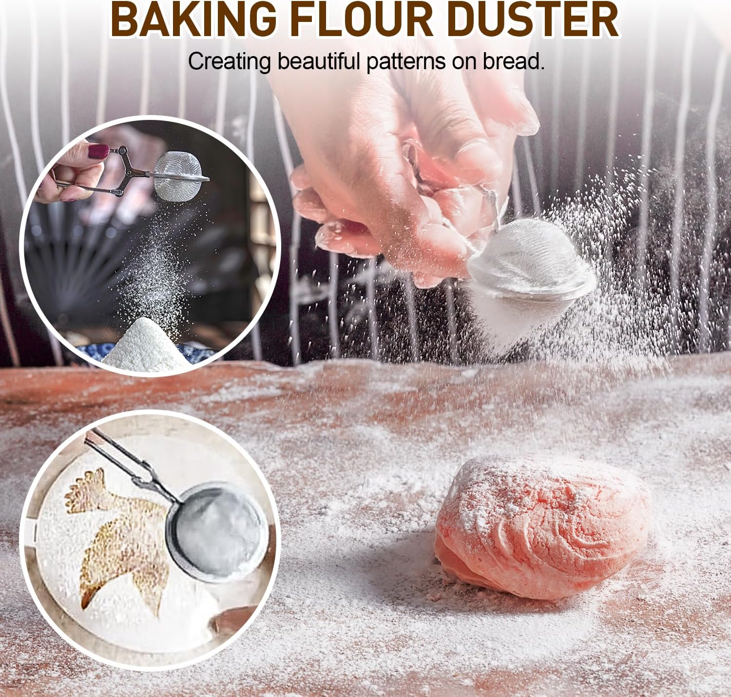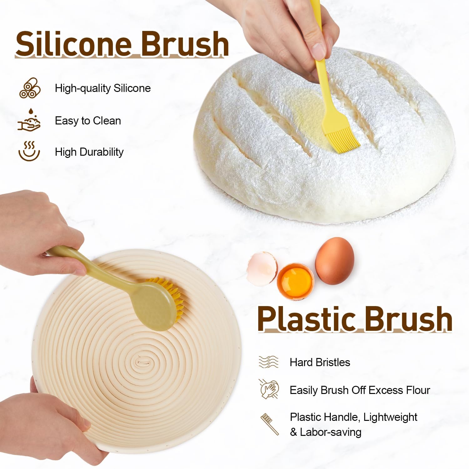 - [What Will You Get] The Sourdough Starter Kit Includes: 1x 9 Inch Round Banneton Basket, 1x 10 Inch Oval Proofing Basket, 2x Linen Liners, 1 × Dough Whisk, 1 × Bread Lame with 5 Blades, 1 × Dough Scraper, 1 × Bowl Scraper, 1 × Silicone Brush, 1 × Cleaning Brush, 1 × Flour Duster, 16 × Baking Stencils, 2 × Silicone Bread Sling, 1 × Baking Mat, 1 × User Manual. This curated set comes with all the essential baking tools you need, packed in a beautifully designed box—perfect for gifting to family or friends who love to bake.
