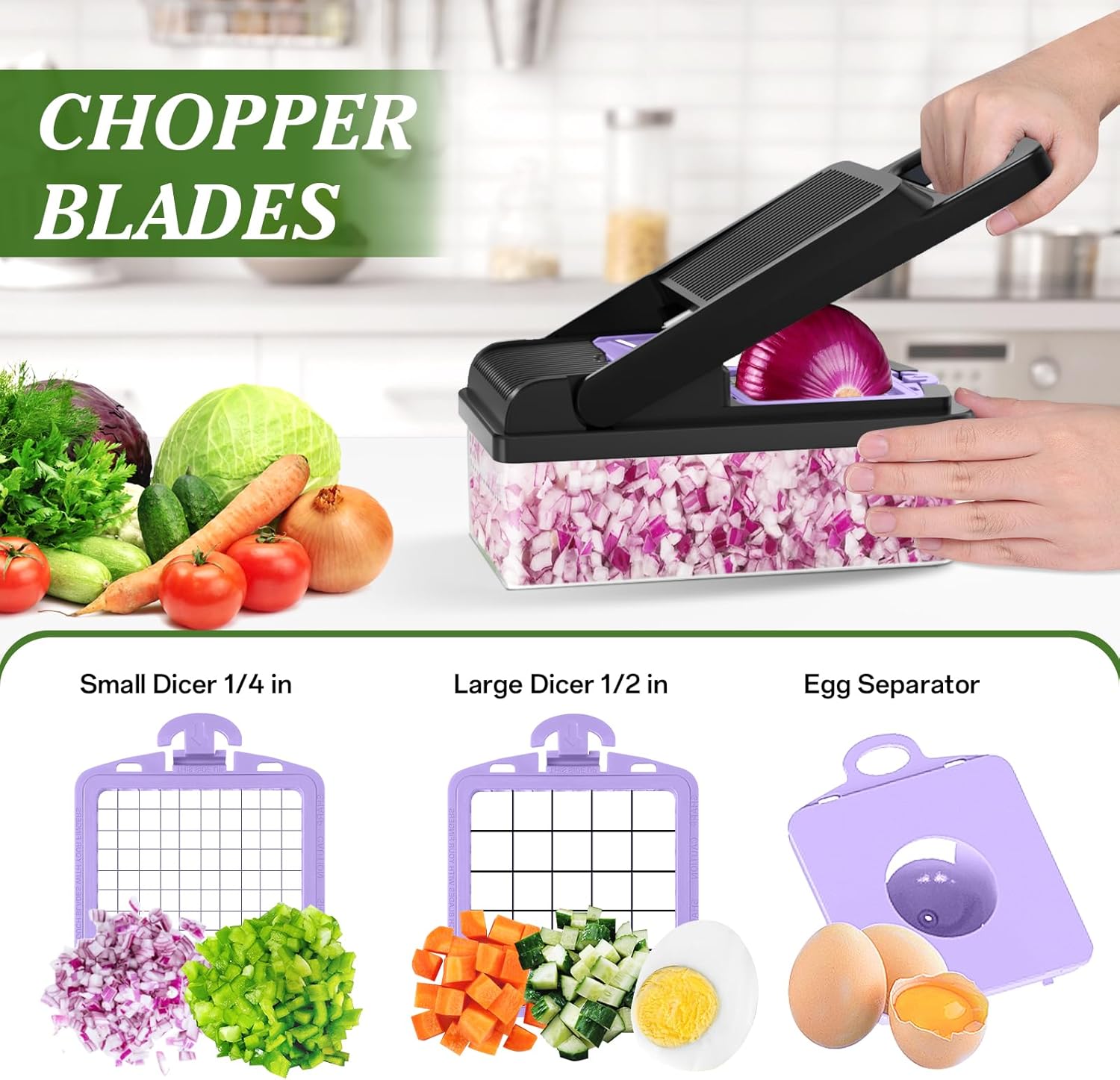 - Versatile Functionality: The vegetable chopper comes with 2 sizes of chopper blades, 5 interchangeable blades for slicing, grating, julienne, and egg separator, which allowing you to cut various foods into different shapes and thicknesses, meeting diverse cooking needs