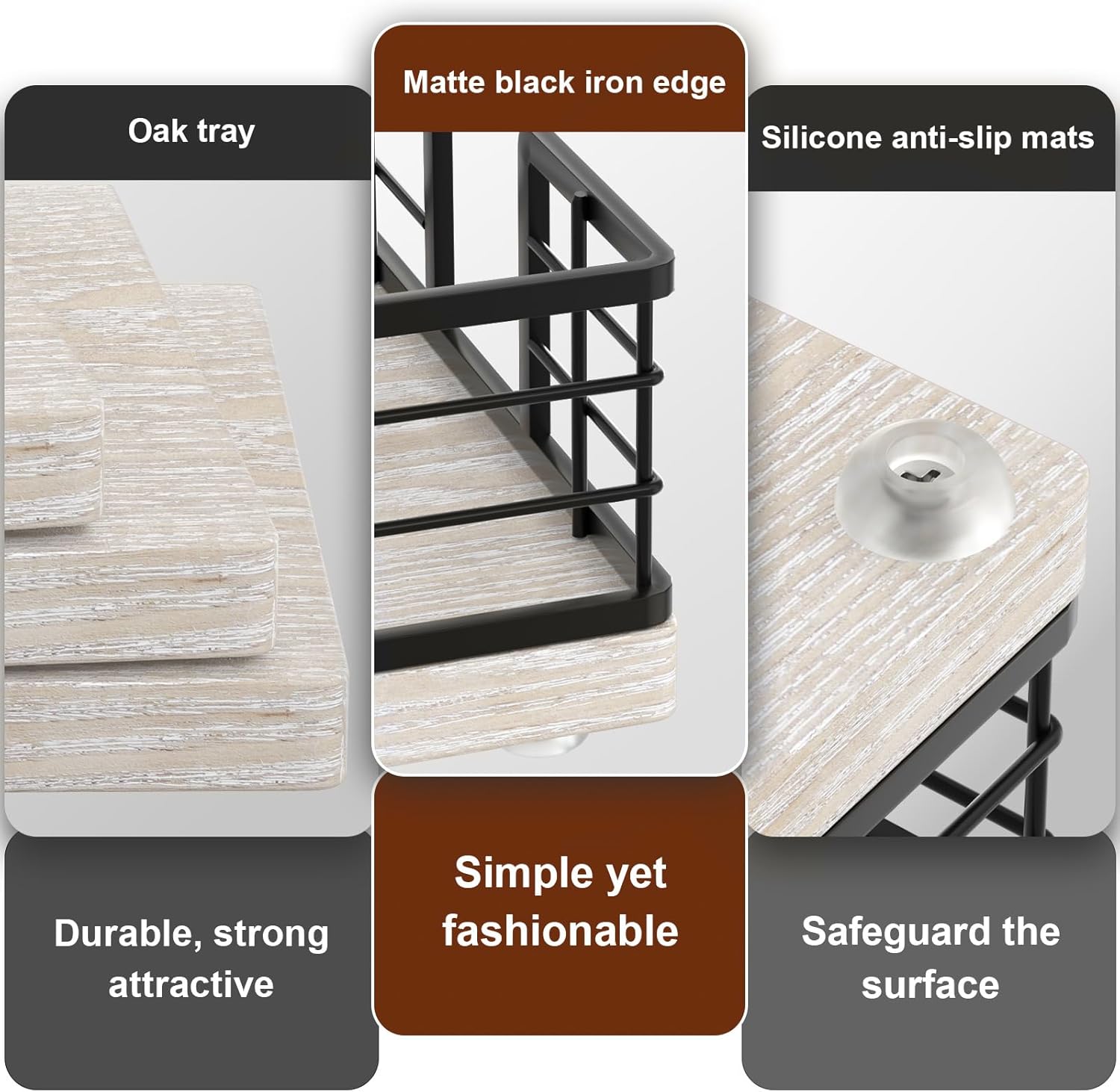 - Cost-effective: No assembly required, easy to clean. The tray crafted from iron and Ash is simple and attractive. The solid bottom ensures items won't fall. With silicone non-slip pads, it provides both anti-slip functionality and better protection for surfaces
