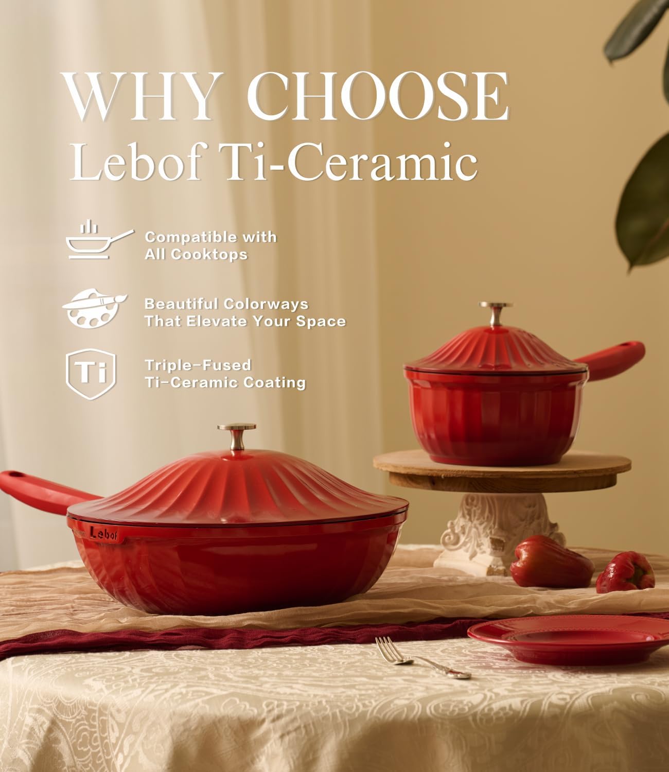- Non Toxic Triple-Fused Ti-Ceramic Coating: Infused with titanium particles, the ceramic coating enhances durability with superior resistance to scratches, abrasion, heat, and corrosion. It extends the nonstick performance, improves chemical stability, and ensures safer, healthier cooking with every use