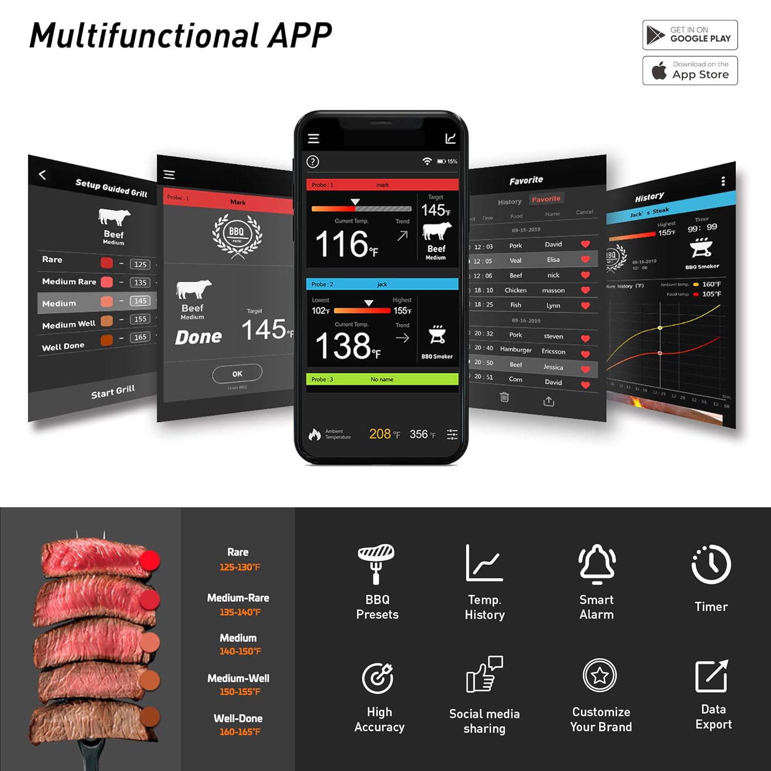- 📱 Smart Bluetooth 5.2 Connection – Up to 328ft Range: Connect your phone via Bluetooth 5.2 and monitor your food remotely. Enjoy up to 328ft signal from dock to probe, and 262ft from phone to dock—ideal for both indoor and backyard cooking.