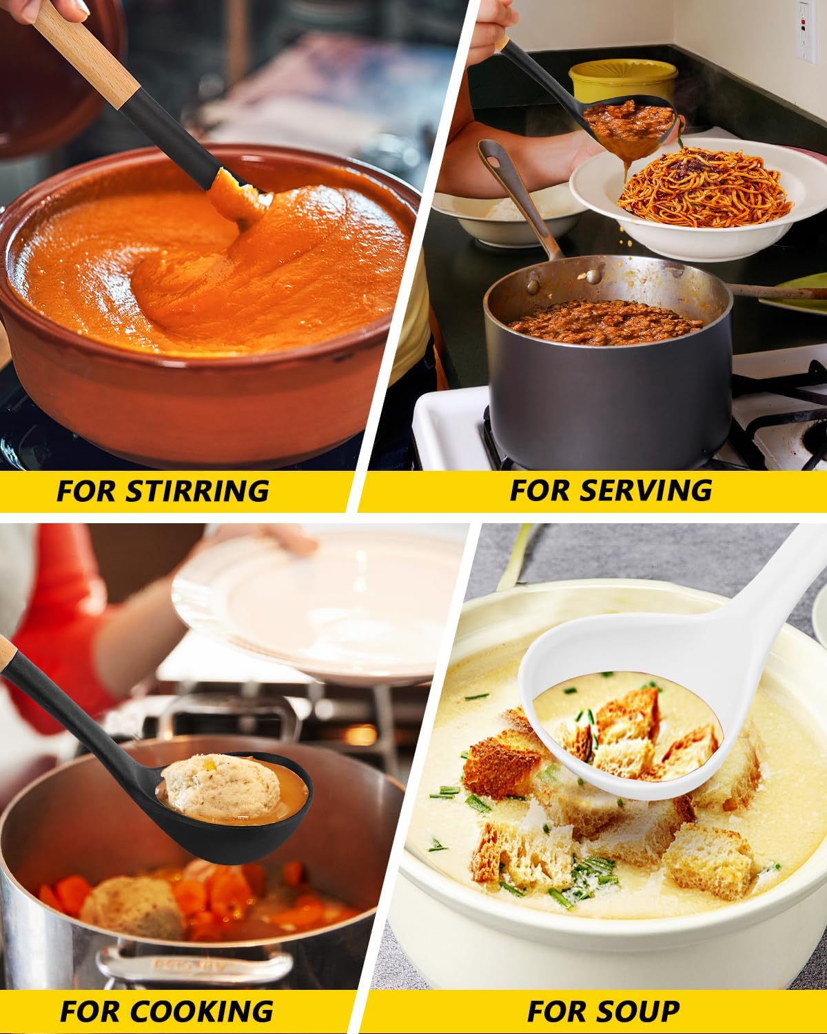 - More Safe and Healthy : Our Soup Ladles are made of food-grade silicone, free of BPA; Even at high temperatures, there is no need to worry about melting or deforming; And the soft silicone head won't scratch the coating, it can better protect your pot