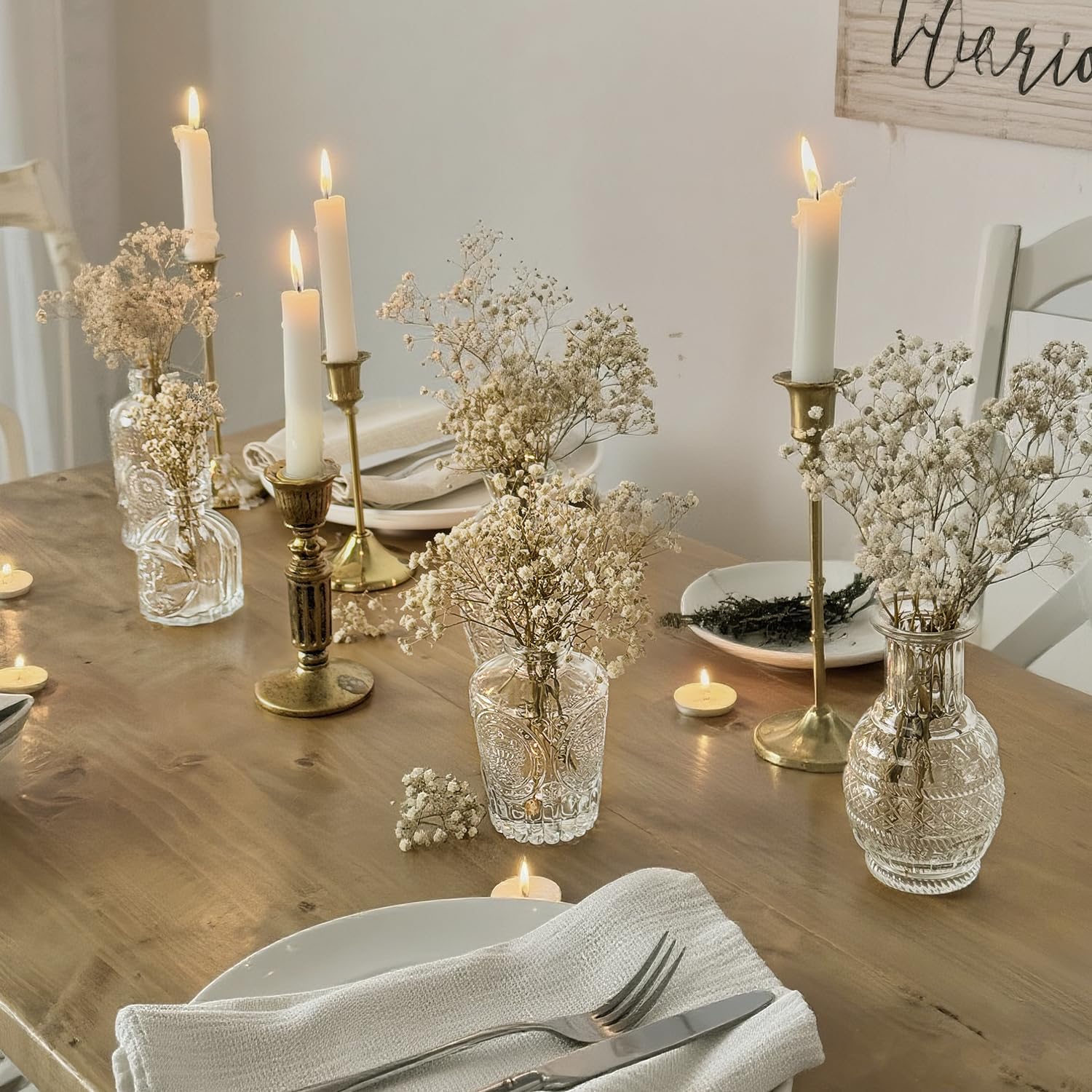 - Versatile Flower Bud Vase Set: This set comprises 10 diverse transparent glass flower bud vases, each adorned with etched designs to further elevate their charm. It is perfectly suited for any home décor. Whether placed as a centerpiece on dining tables, window sills, or wedding banquet tables, these small vintage crystal vases will lend an air of elegance to the setting.