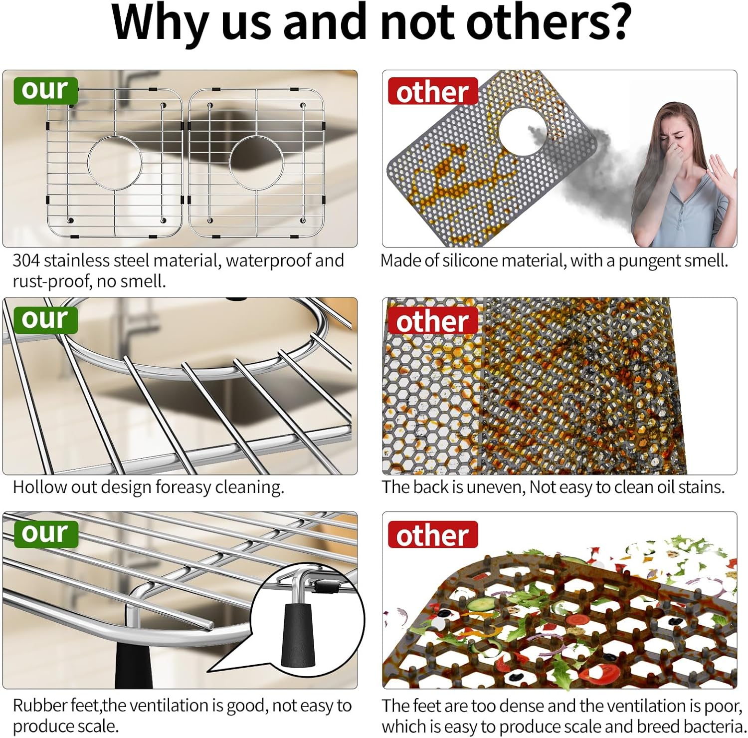 - High Quality Metal Sink Grid: This sink protector grid is made of stainless steel and is more practical than the sink rack made of silicone. It has no unpleasant smell, is dirt and scratch resistant, easy to clean, sturdy, and most importantly, it has the functions of corrosion and rust prevention, and can be used for a long time. It is the perfect choice for protecting the sink.