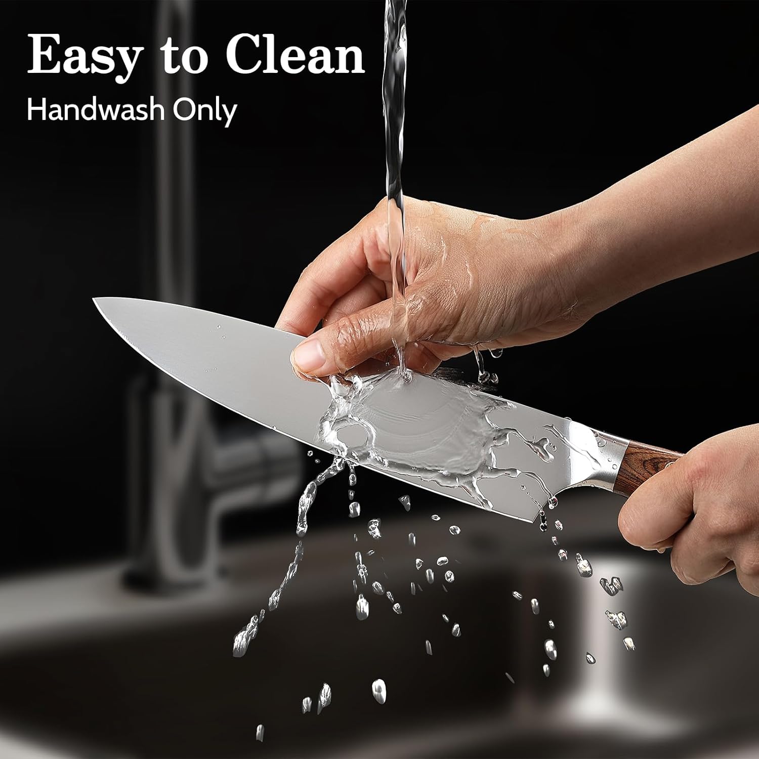 - 【Well-Balanced Kitchen Knife Set】The blades and handles of this set are perfectly balanced, allowing you to easily tackle everyday kitchen tasks like chopping, slicing, and dicing. The ergonomic wooden handle provides superior comfort, helping to minimize fatigue, numbness, or pain during use.