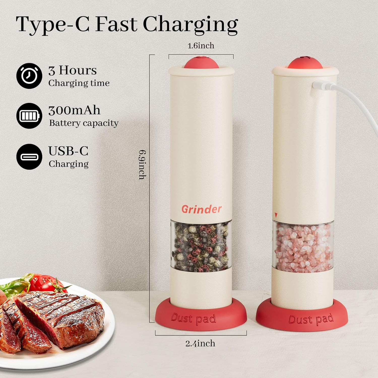 - Rechargeable and Sustainable: Our DGINGEFATY rechargeable salt and pepper grinder set (also electric salt and pepper grinder set rechargeable/salt and pepper grinder set rechargeable) includes a Type-C cable for quick charging. This rechargeable salt and pepper grinder works for ~1 month per charge, cutting disposable battery costs and supporting a greener lifestyle.