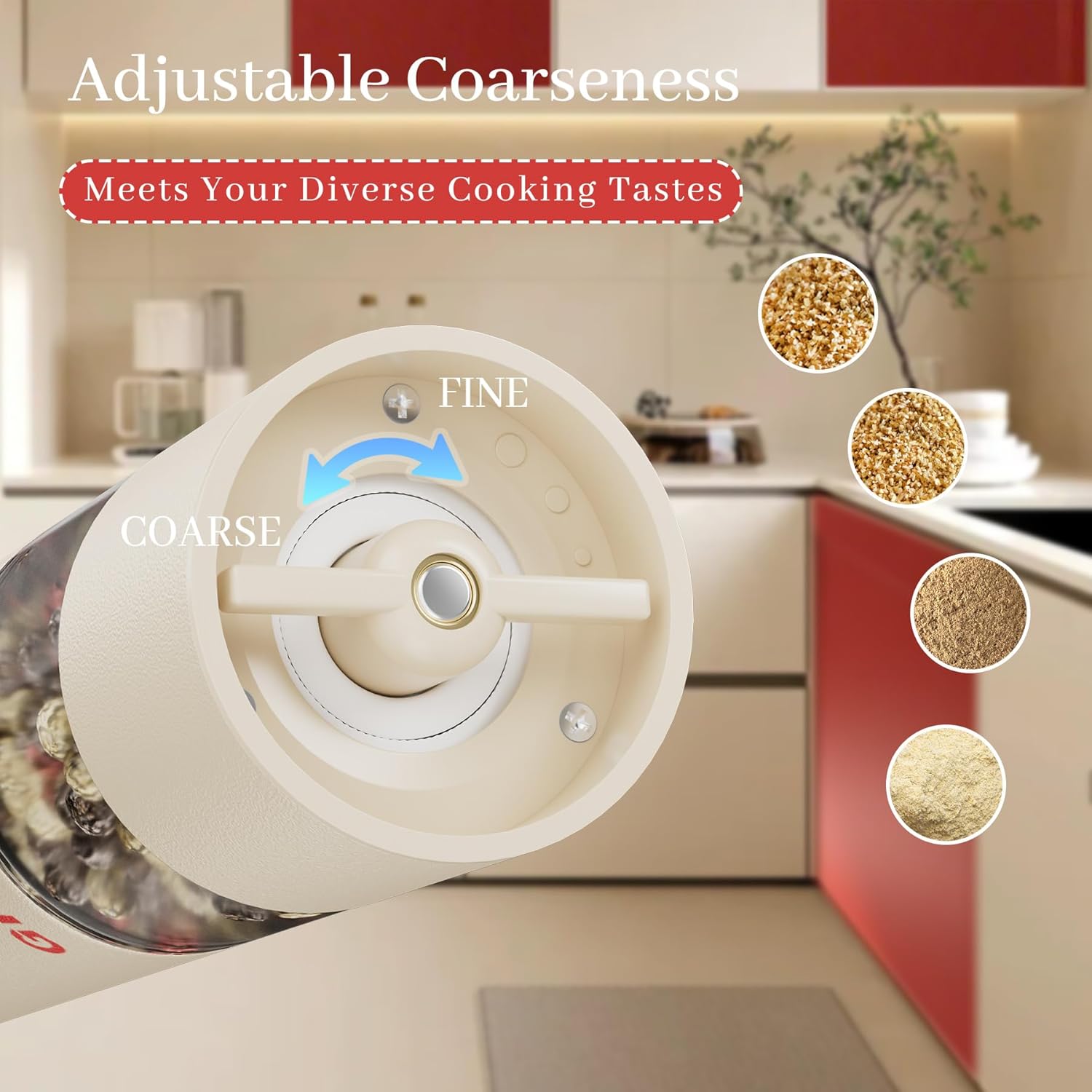 - Easy One-handed Operation & Adjustable Coarseness: Just hold the button for fresh spices. Choose the perfect automatic salt and pepper grinder set (also an electric/auto salt and pepper grinder set) by turning the knob anticlockwise. This salt and pepper automatic grinder set is more convenient than manual grinders—great for busy meal prep, kids, seniors, and those with arthritis, boosting your life quality.