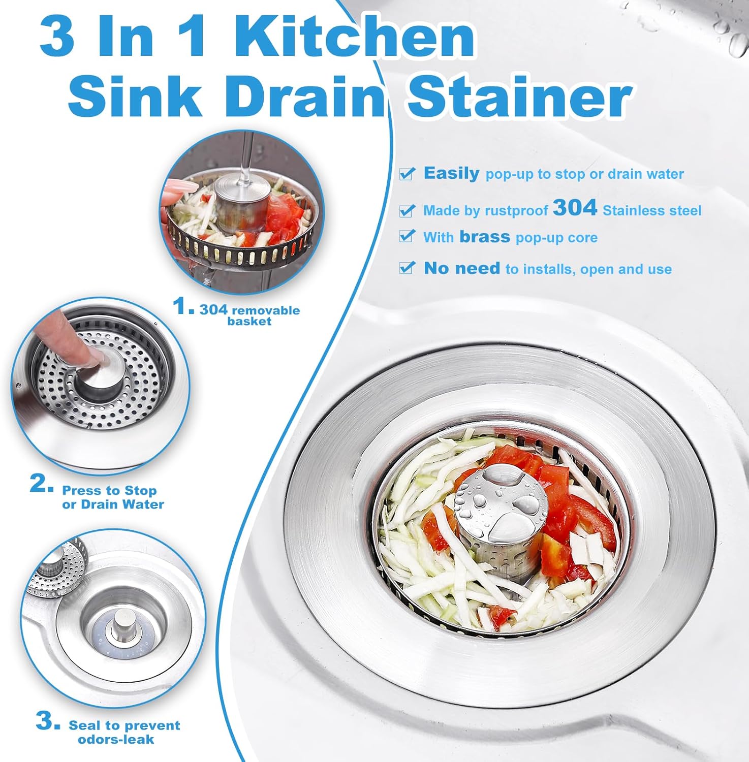 - 3-in-1 Sink Stopper & Strainer: This innovative kitchen essential functions as both a sink drain stopper and strainer, allowing you to stop up the sink to soak dishes or pop it open to drain water and catch garbage and food waste—a must-have for any home and kitchen.
