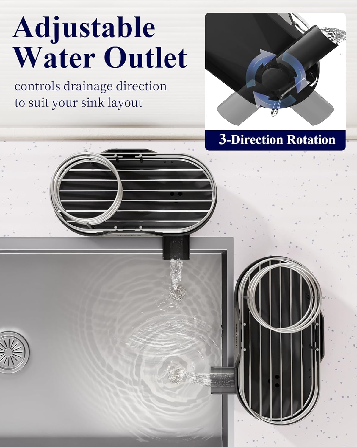 - ROTATABLE WATER OUTLET: Equipped with a 270° rotating drain spout, this kitchen sink organizer efficiently channels water directly into the sink—no tilting or lifting required. Continuous drainage keeps sponges and other cleaning tools dry while helping to prevent water stains on your counters.