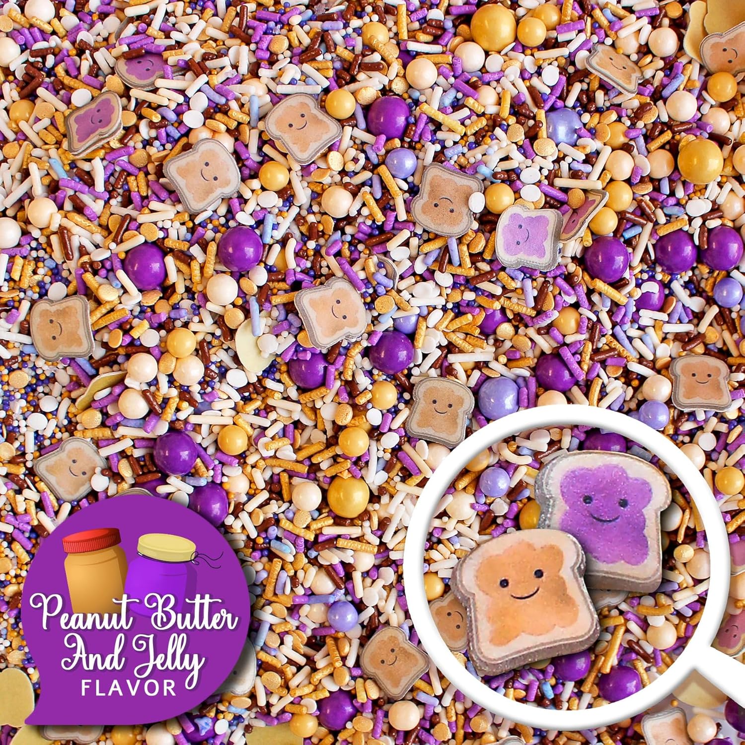- Whimsical Peanut Butter and Jelly Sandwich theme featuring a playful blend of lavender, gold, cream, and chocolate sprinkles with peanut butter and grape jelly wafer paper pieces for decorating cupcakes, cakes, cookies, and more. A fun, nostalgia-filled sprinkle mix that adds personality and charm to kids’ parties, back to school themed desserts, and novelty baked treats