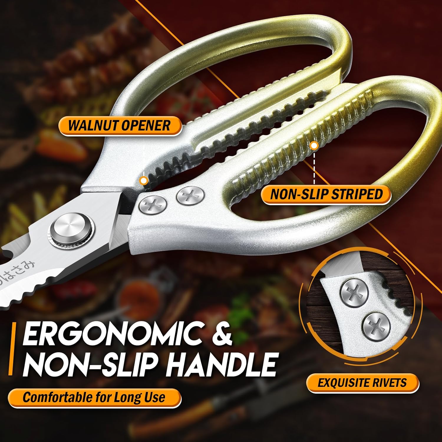 - 【Engineered for Effortless Control】TIJERAS' ergonomic handles nest perfectly in your palm, offering superior leverage whether dicing herbs or cutting meat. The anti-slip gold-finish grip ensures safety and comfort, banishing hand strain during marathon cooking sessions.
