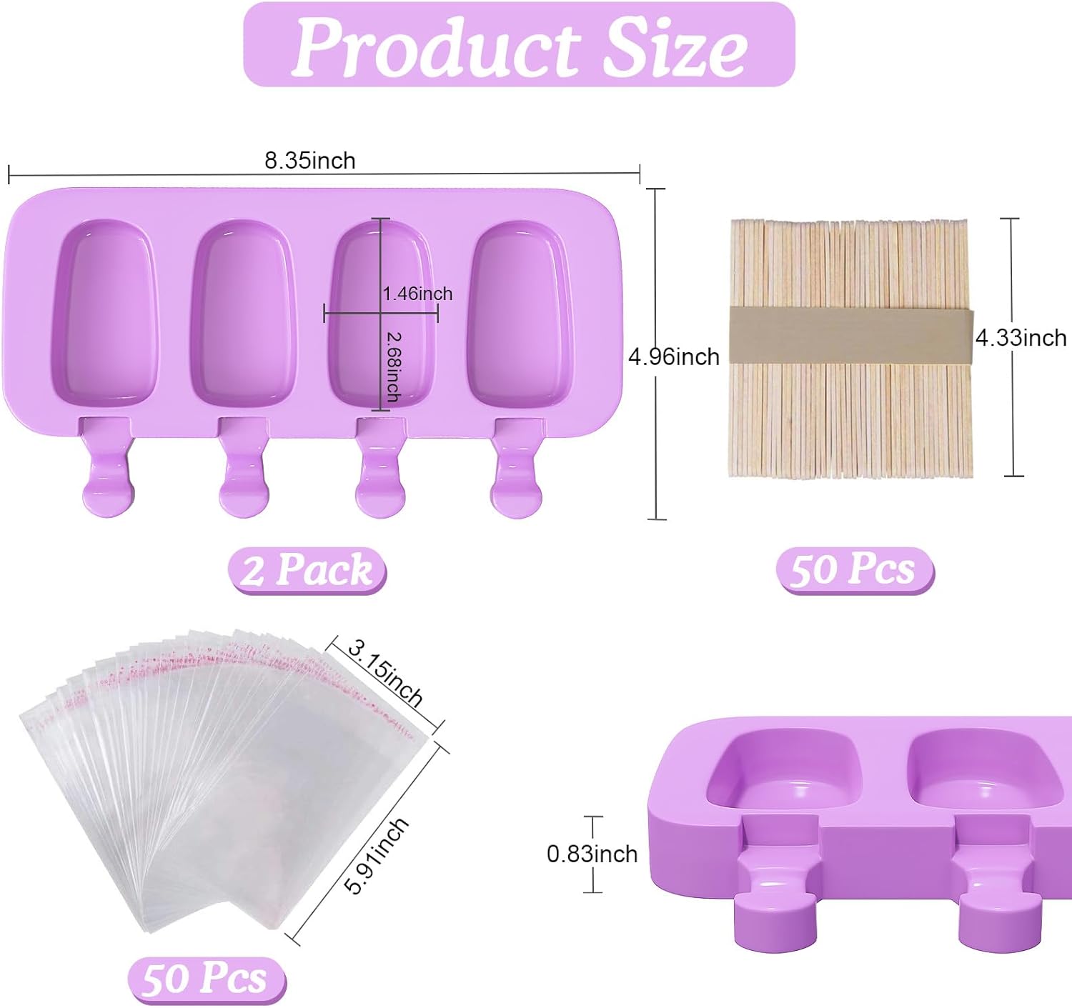 - Product Size: This cake pop molds are horizontal, easy to clean after using, the overall size of the cakesicle molds silicone is 8.3" x 4.84" x 0.83", single cavity size is 2.68" x 1.50", can make 8 piece popsicles of the right size one time