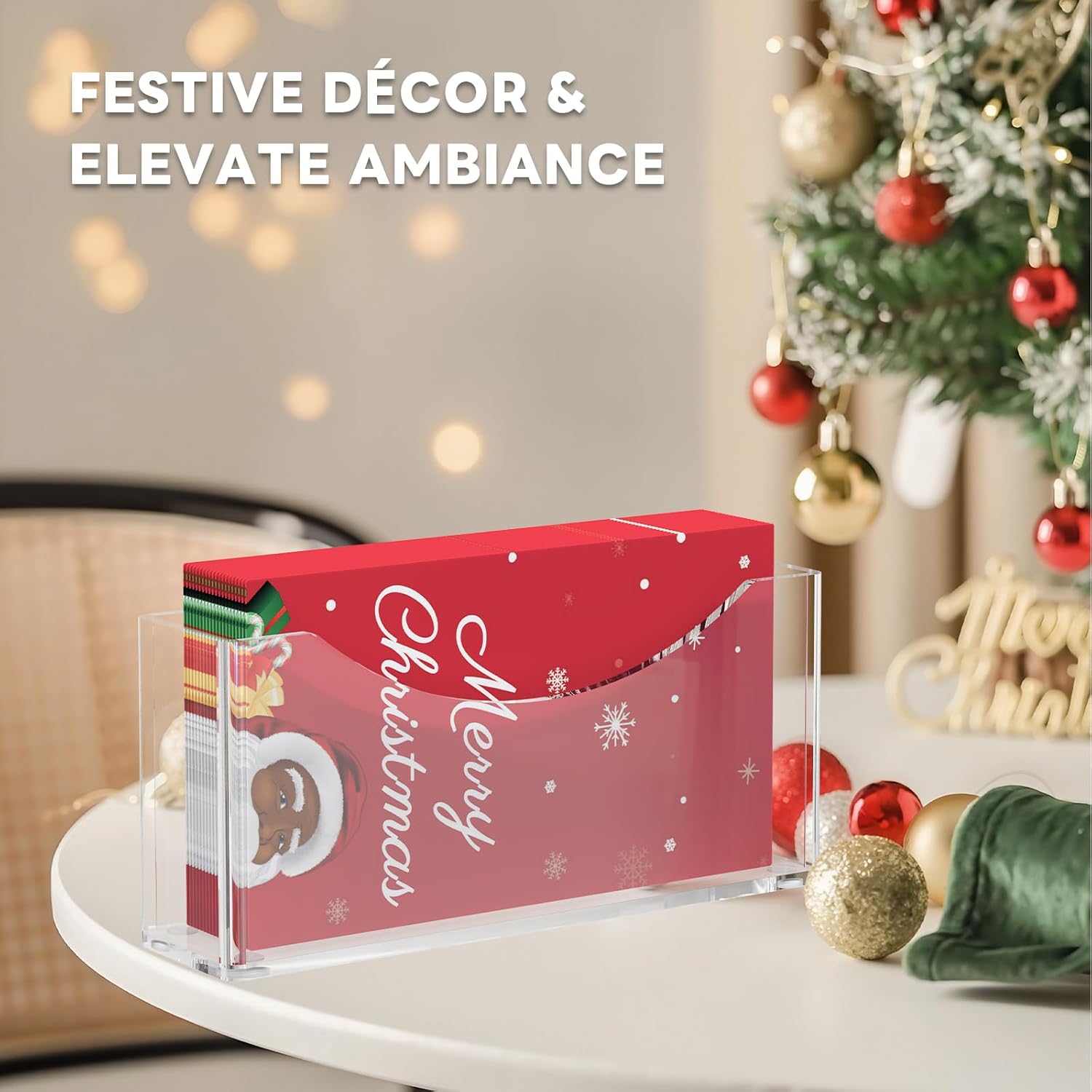 - [ELEGANT DECORATION] Simple and fashionable design, suitable for mainstream tissue brands, the napkins holder can clearly display holiday limited patterns and hand-painted style tissues, instantly enhancing the decorative effect of dining tables, coffee bars, and sinks