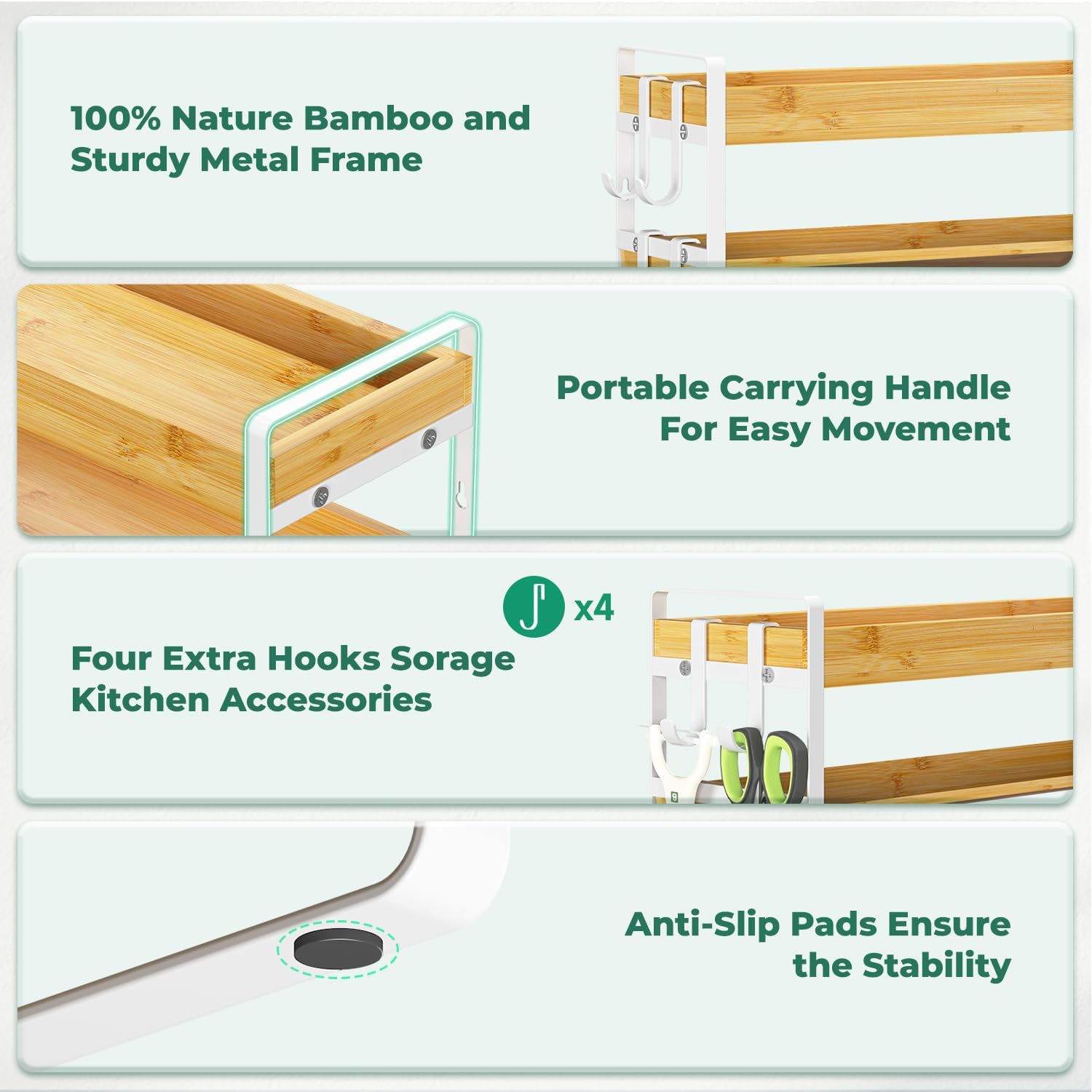 - 4 Hooks & Anti-Slip Pads: Comes with 4 movable hooks to hang kitchen utensils and 4 anti-slip pads to keep the pantry spice rack organizer stable and protect your surfaces from scratches and shifting