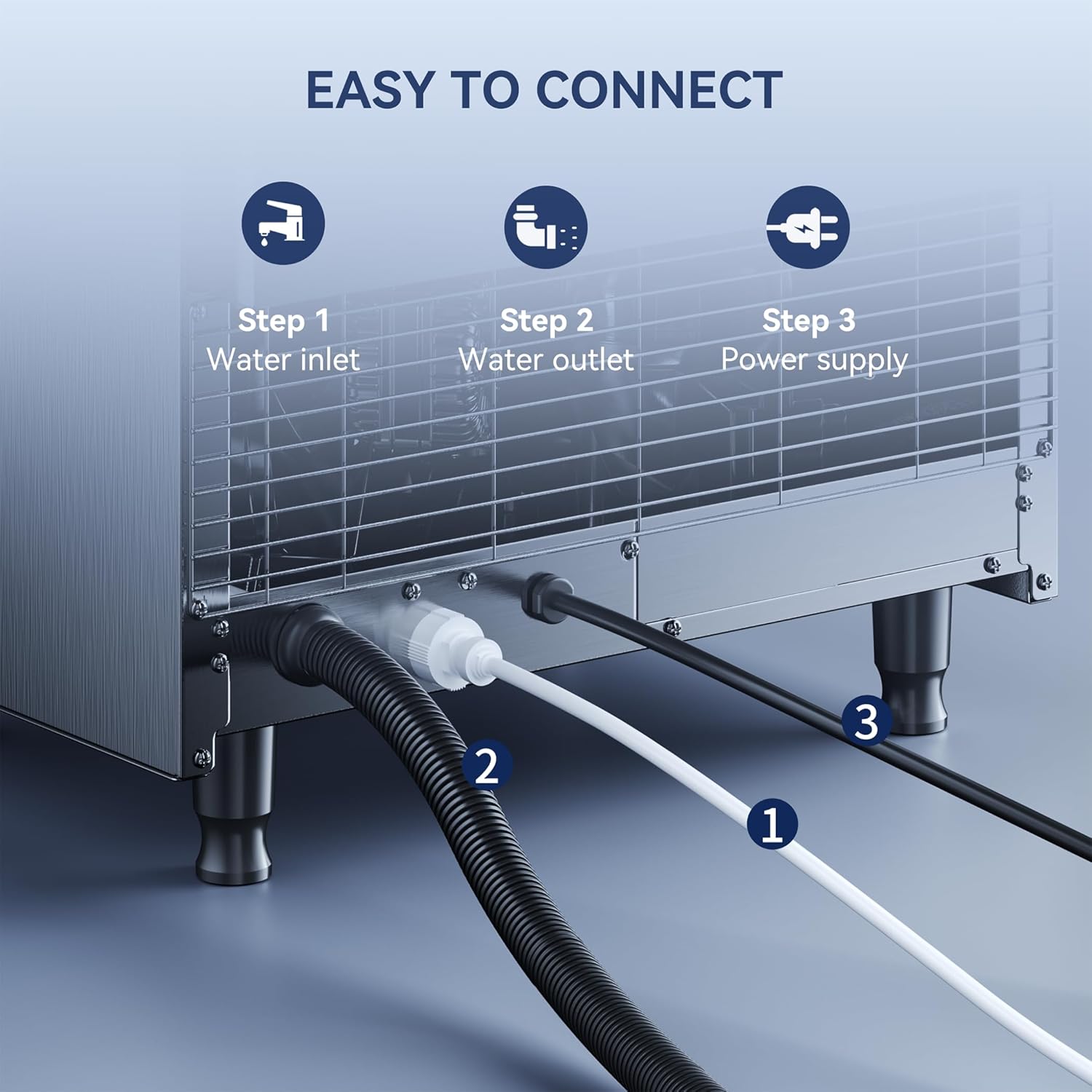 - Package Include: The commercial ice machine comes with a full set of accessories including water inlet hose, outlet hose, water filter and ice scoop.You just need to connect the inlet and the drain hoses, and it will automatically fill and drain the water. And then start the cycle of ice-making.Ensure it's upright for 24 hours before use.