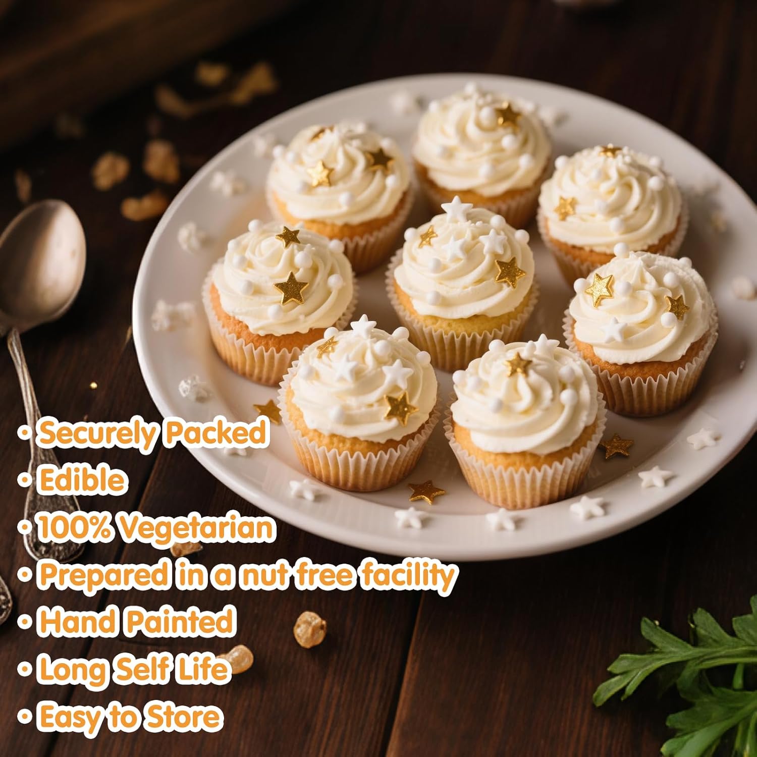 - Gold and White Star Sprinkles with food-grade raw materials:Preservative Free,Nut Free,Dairy Free,Chemical Free,Soy Free,Non-GMO.Produced using food-safe standards,the process does not come into contact with allergenic substances and uses Tamper-proof food label