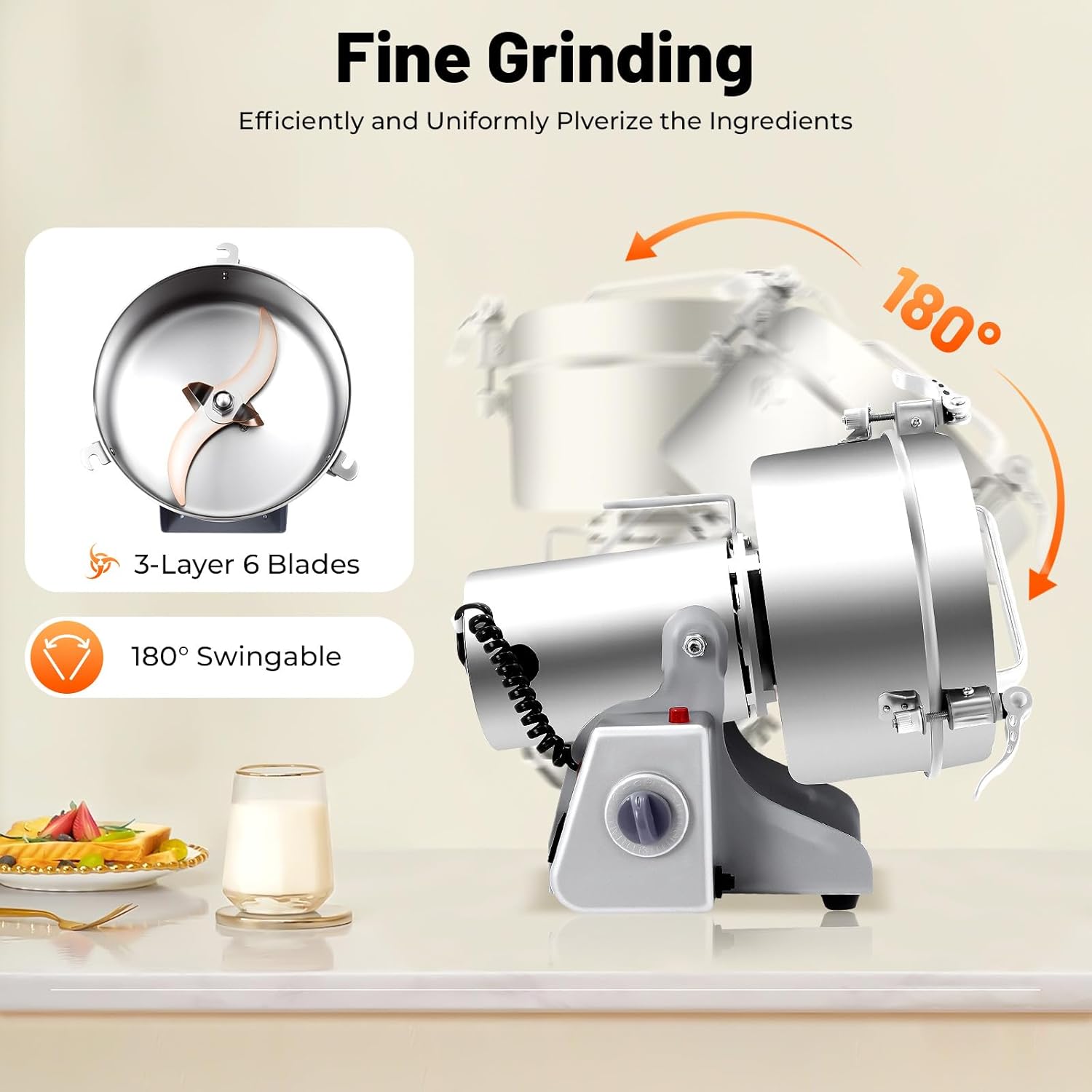 - 🍕【Grain Grinder Parameters】Capacity: 2500g/5.51 lbs, Material: 304 stainless steel and iron, Voltage: 110V, Rotating speed: 32000r/min, Power: 4500W, Grinding degree: 50-300 mesh, Working time: 1-5 min, Interval time: 10 min