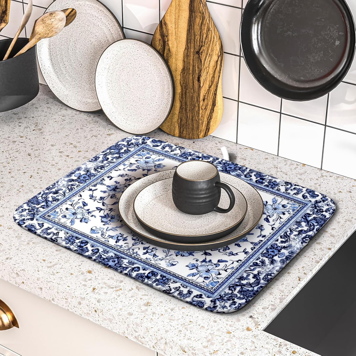 Boho Floral Dish Drying Mat 16x18 Inch Blue Leaves Kitchen Drying Pad Reversible Absorbent Dish Drainer Rack Mats Counter Tableware Decor
