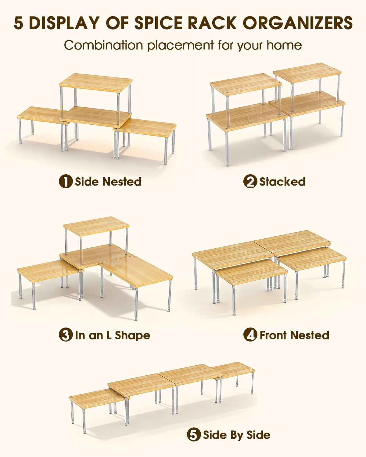 - Versatile Design for Flexible Use: Includes 2 large (11.8"x7.9"x6.3") + 2 small (10.5"x6.5"x5.5") shelves. This spice rack offers ultimate flexibility—stack them for vertical storage or place two side by side for a wider layout