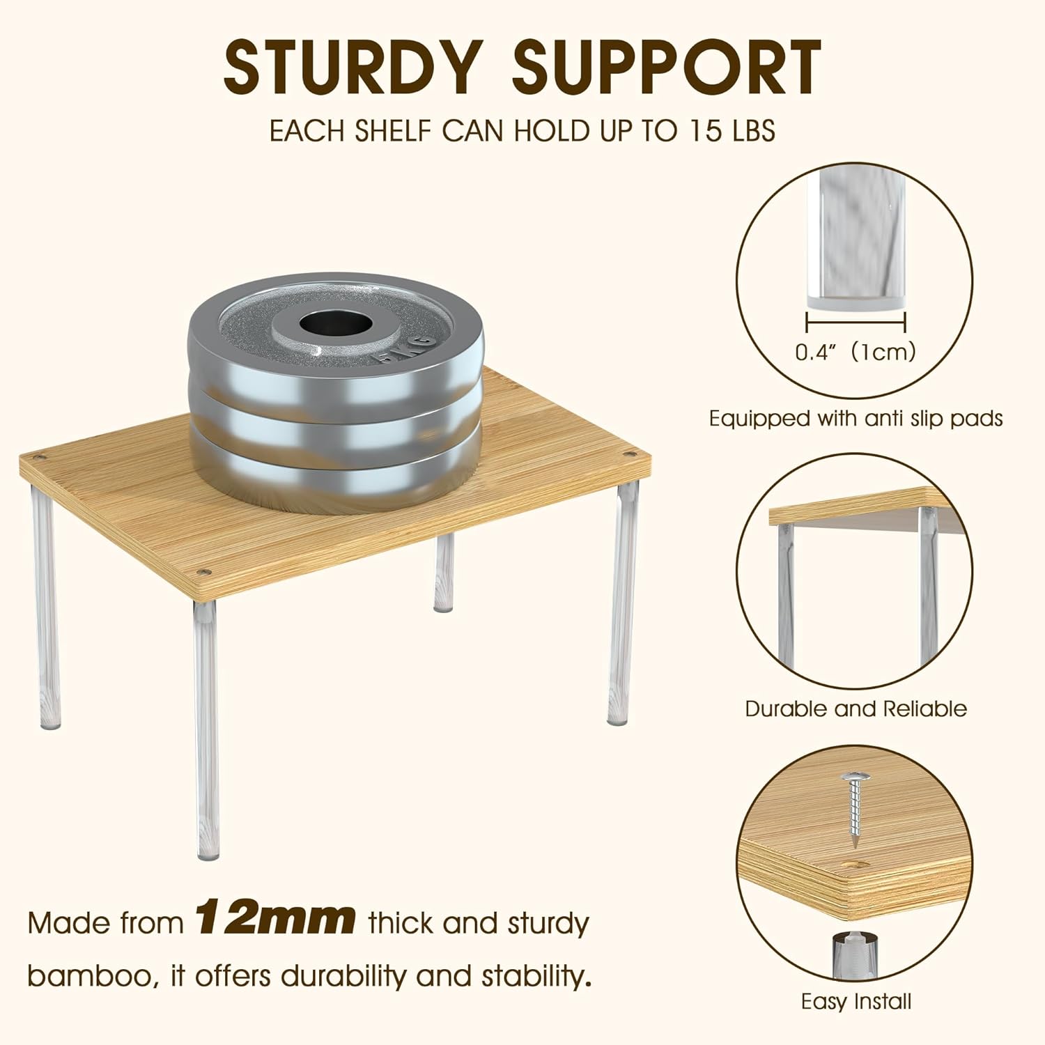- Sturdy Construction & Contemporary Charm: Two-tier design with natural bamboo shelves and acrylic frame for durability. Crafted from premium 1.2cm-thick bamboo—30% stronger than standard racks—our shelves bear 15 lbs evenly. Non-slip feet prevent wobbling, while food-grade material resists stains and odors