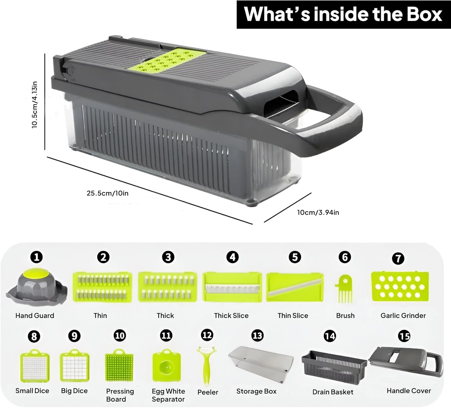 - 16-in-1 Multipurpose Kitchen Tool – Includes 8 interchangeable blades, large-capacity container, egg separator, blade storage box, and cleaning accessories. Ideal for chopping, slicing, dicing, grating, and shredding a variety of vegetables and fruits.