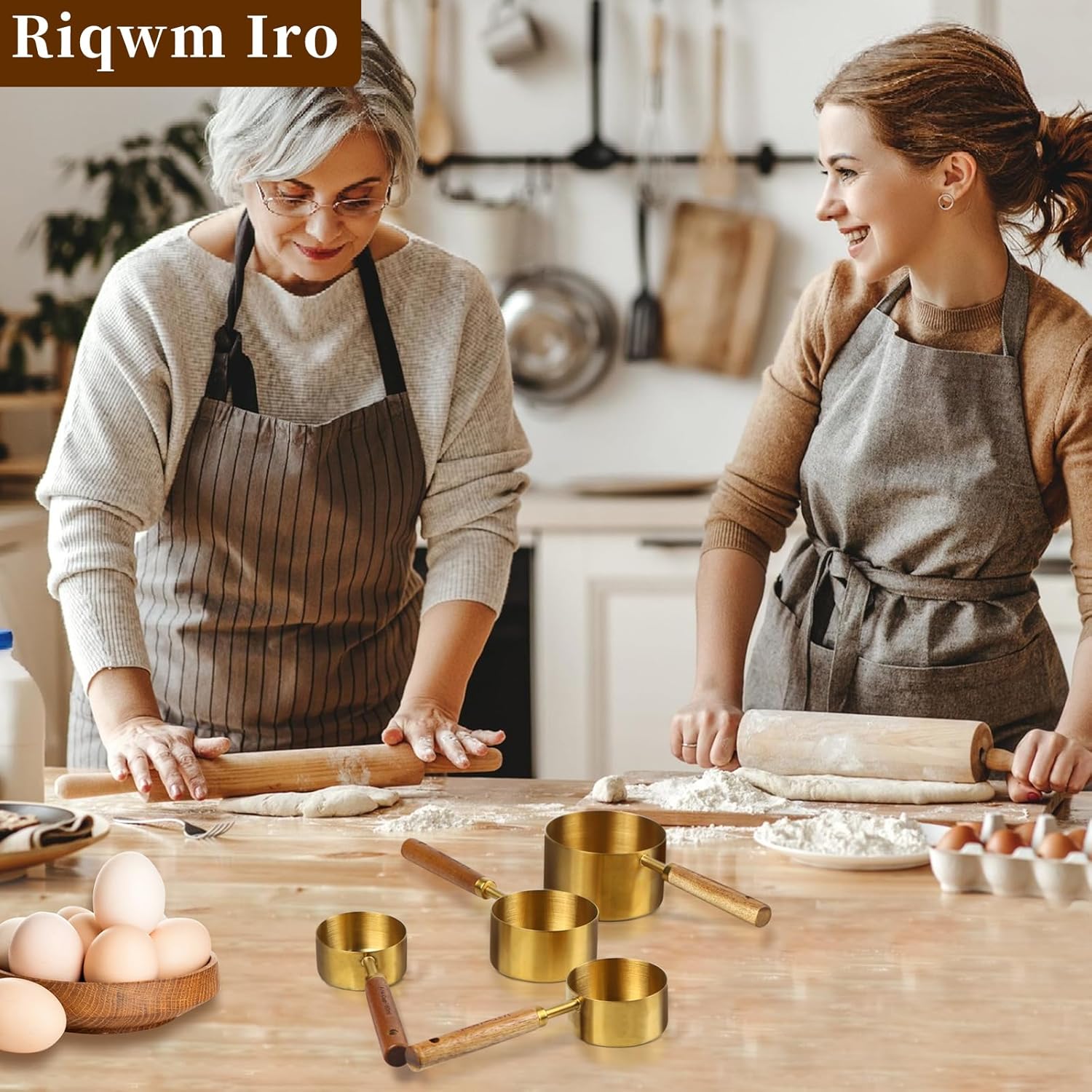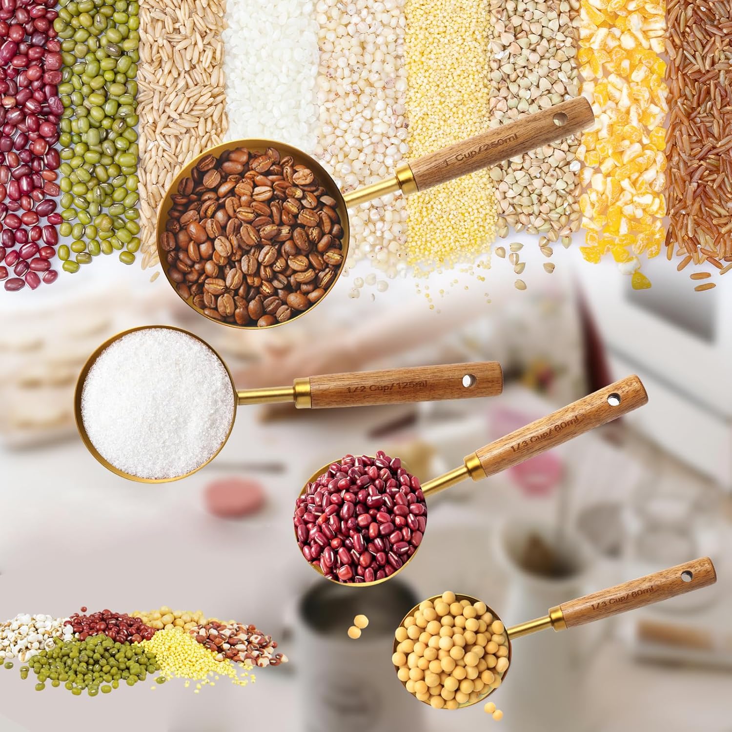 4 Piece gold measuring cups set,Golden Stainless Steel Measuring Cup and spoons set with Wooden Handle for Food/Liquid/Baking in the Kitchen