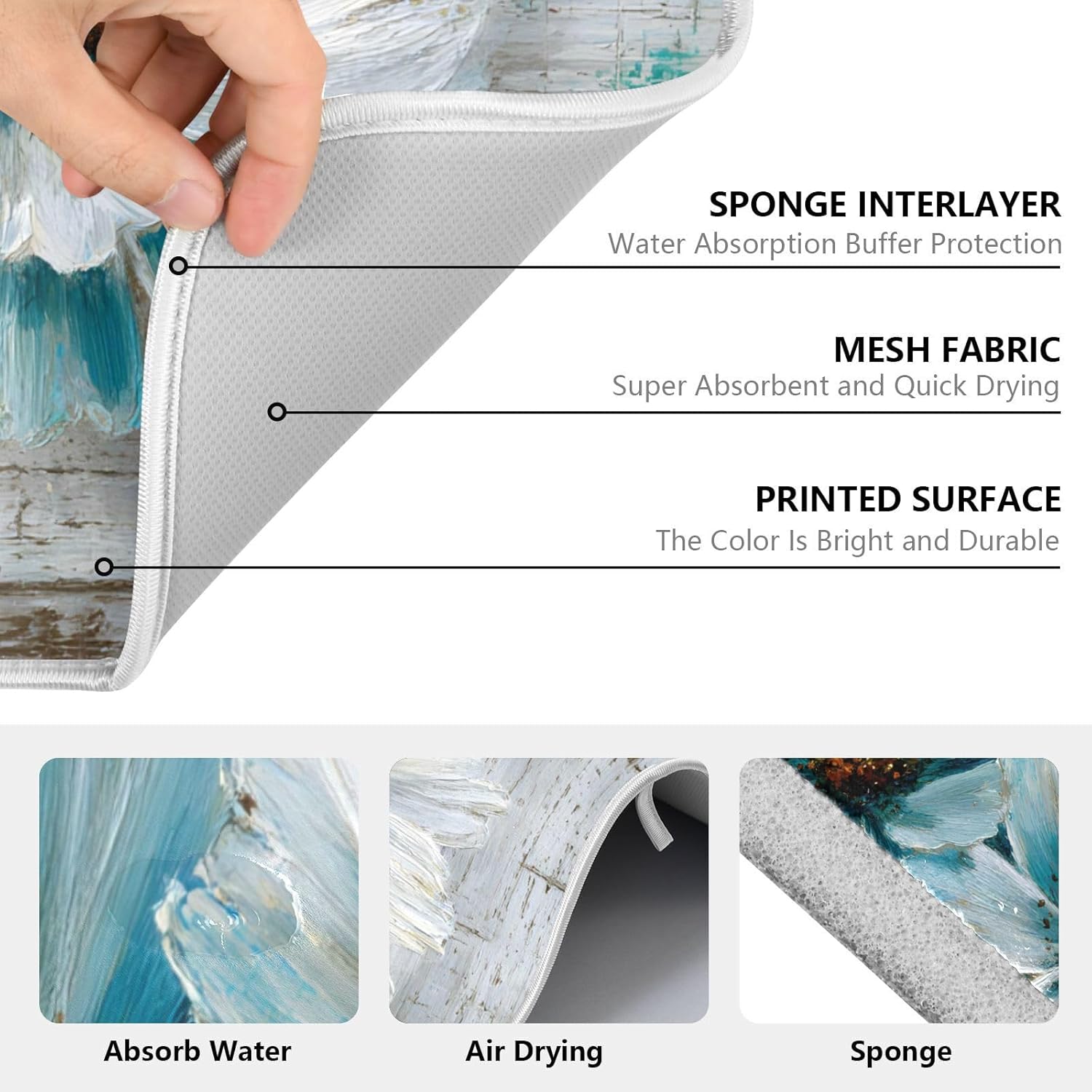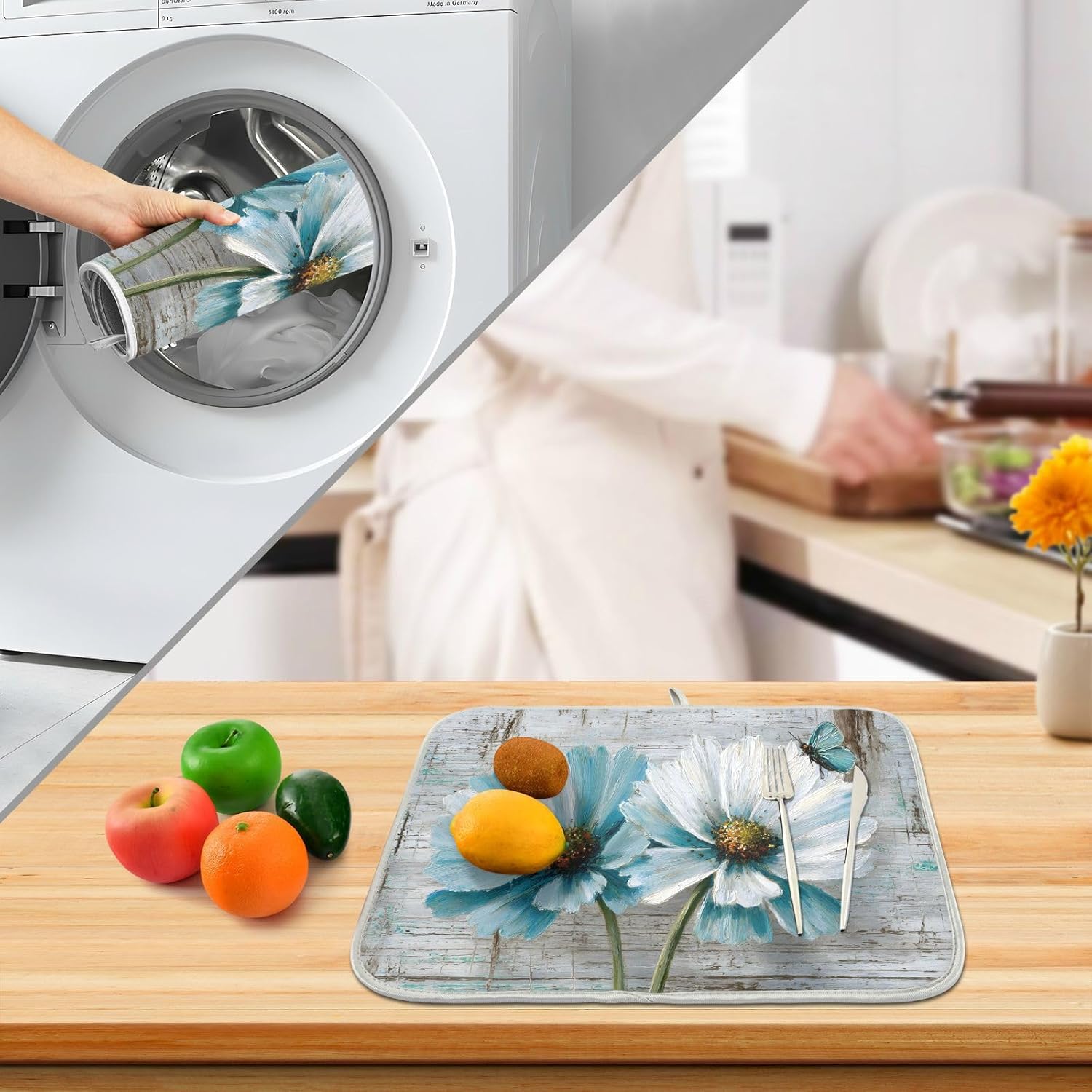Rustic Teal White Daisy on Vintage Wooden Dish Drying Mat for Kitchen Counter Absorbent Microfiber Large Drying Pad Dish mats for Kitchen Countertops 18 x 24 Inch