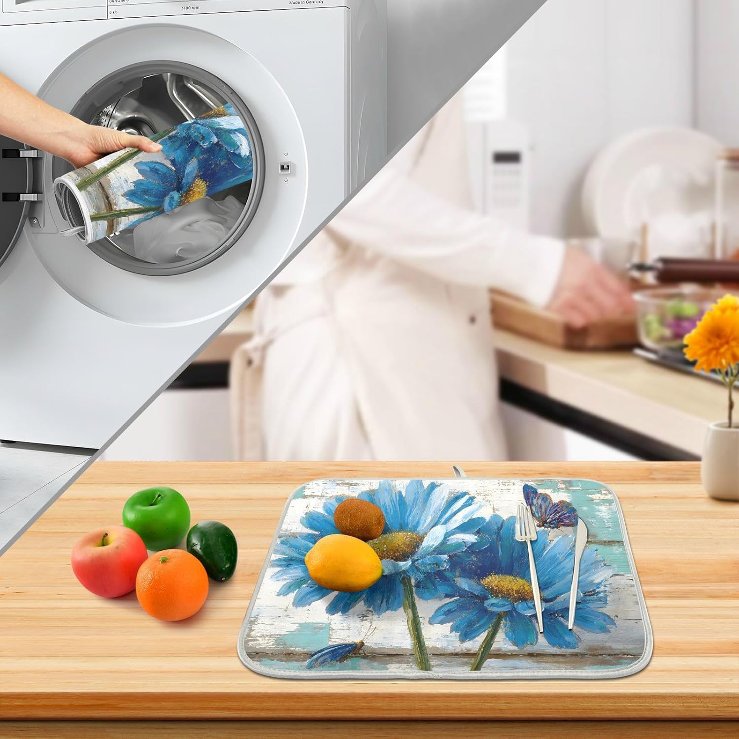 Rustic Daisy Blue on Vintage Wooden Dish Drying Mat for Kitchen Counter Absorbent Microfiber Large Drying Pad Dish mats for Kitchen Countertops 18 x 24 Inch