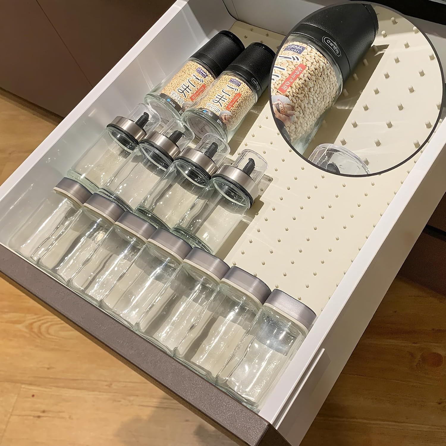 Gosmol Spice Drawer Organizer insert, Adjustable & Non-Slip Silicone Spice Drawer Liner, in Drawer Spice Organizer for Seasoning Jars and Spices Bottles Spice Rack -Pearl