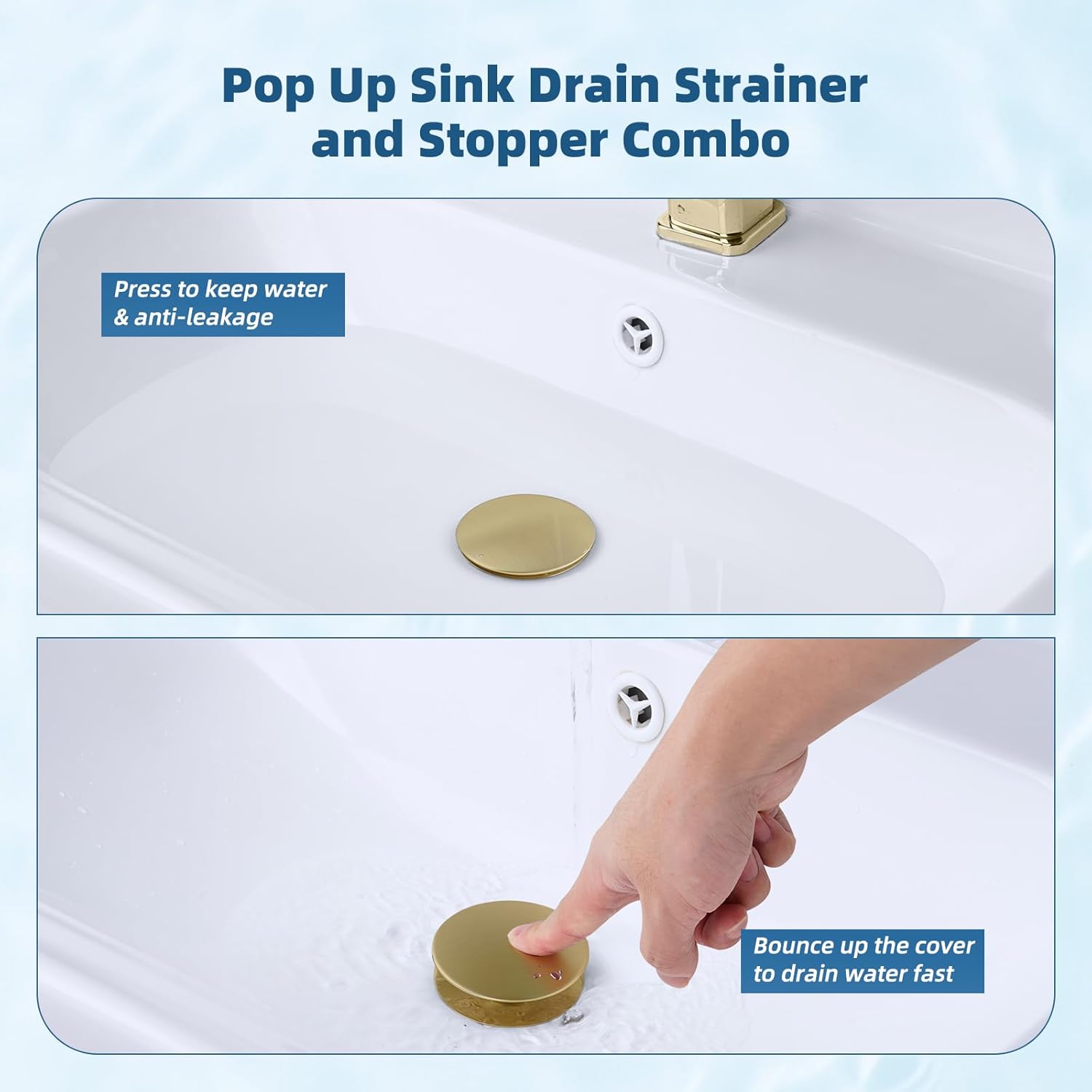 - [Pop-up Design with Big Push Cap] Our sink drain strainer is made of high-quality stainless steel, solid brass, and plastic, providing exceptional rebound strength, corrosion resistance, and long-lasting durability. It features a sensitive pop-up solid brass bullet core, allowing you to easily switch between the water storage and fast drainage with just a gentle press. The large metal push cap has an innovative design that allows both finger and palm pressing for a more comfortable experience