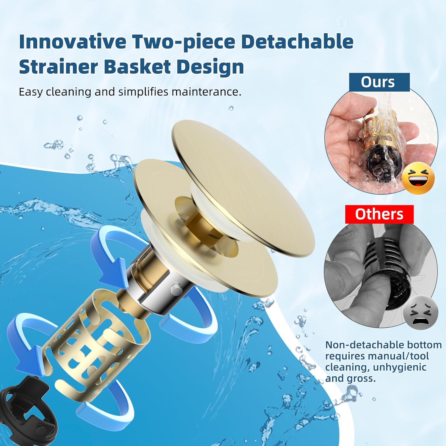 - [Easy Installation and Maintenance] The installation is quick and hassle-free, simply remove your old stopper and insert the new one into the drain hole, installation only takes a few seconds. Cleaning is just as easy. The dual-layer removable basket can be easily removed by simply twisting, allowing you to thoroughly clean all components of the drain stopper. The basket's detachable bottom design prevents the awkwardness and inconvenience of digging out items by hand