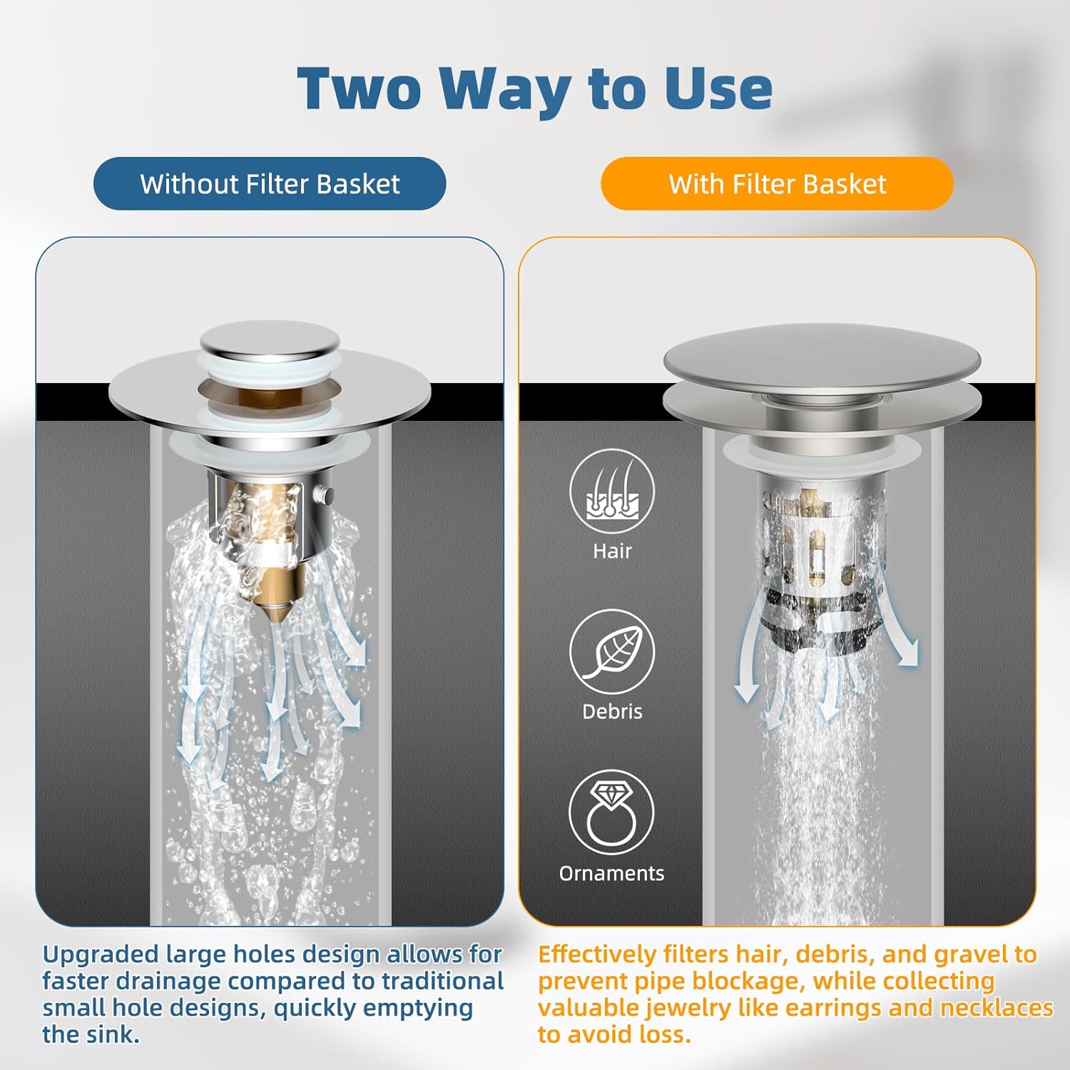 - [Innovative Two-Layer Removable Basket] Our sink stopper features a dual-layer removable stainless steel basket designed for two usage modes. With the basket in place, it effectively filters small items to prevent blockages. When removed, the sink strainer enables swift drainage through two larger holes, promoting faster water flow and streamlining your daily tasks. Plus, the two-piece removable basket is easier to clean and maintain, ensuring better hygiene than traditional fixed-bottom baskets
