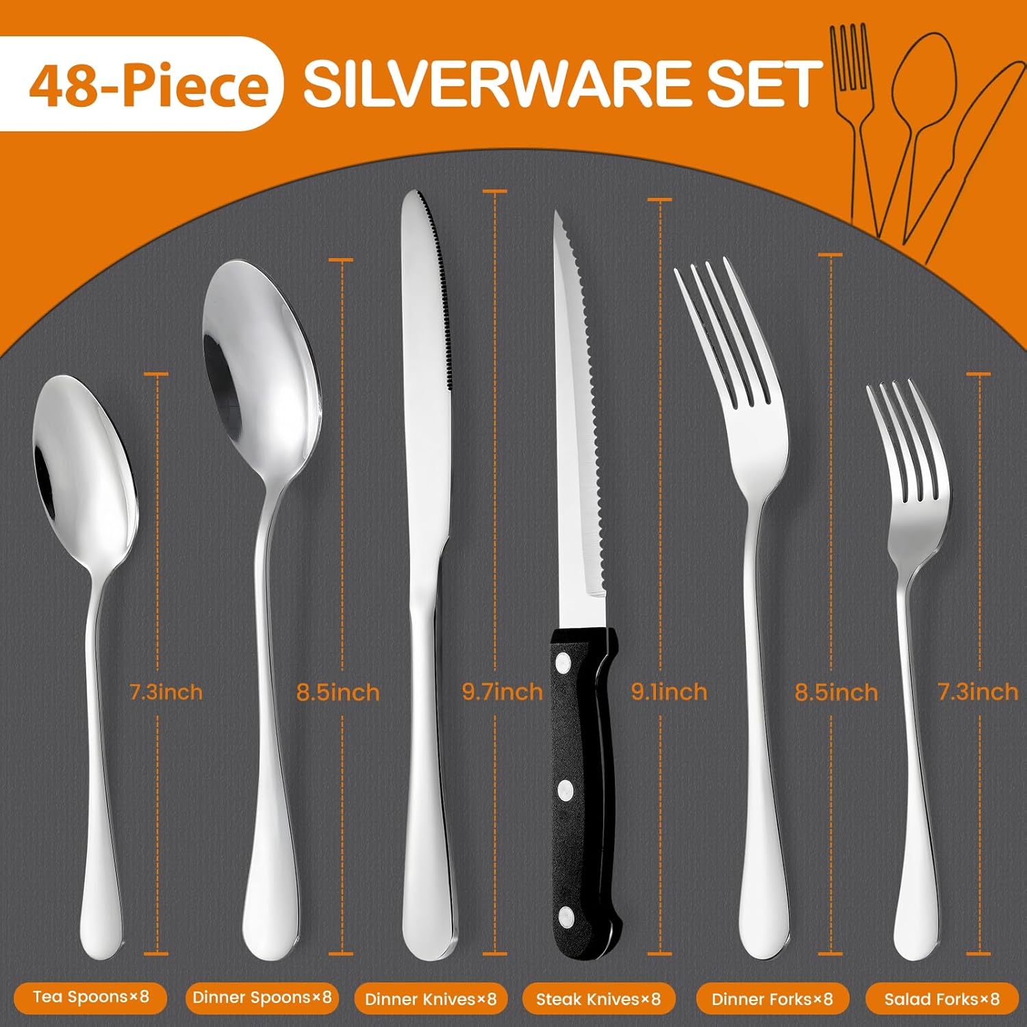 - 【49-PIECE SILVERWARE SET FOR 8】- The cutlery set Includes 8 dinner forks, 8 salad forks, steak knives set of 8, 8 dinner spoons, 8 teaspoons, and 8 dinner knives, plus a durable 6 compartment organizer - perfect for catering, picnics, weddings, BBQ, holiday dinners, party serving, family reunions and everyday use