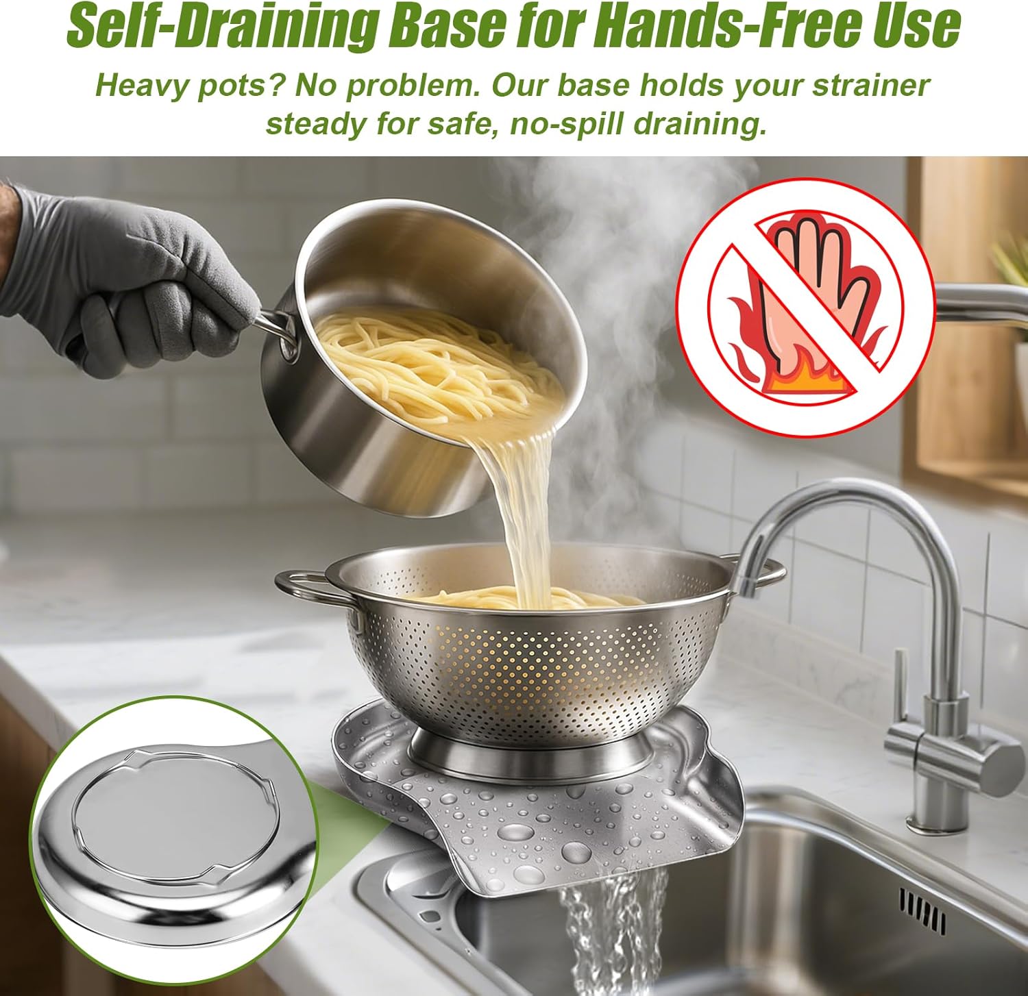 - Hands-Free Draining for Pasta & Noodles – Ideal for noodle colanders and pasta colanders, the base allows water to drain naturally so you can multitask in the kitchen without holding the strainer.