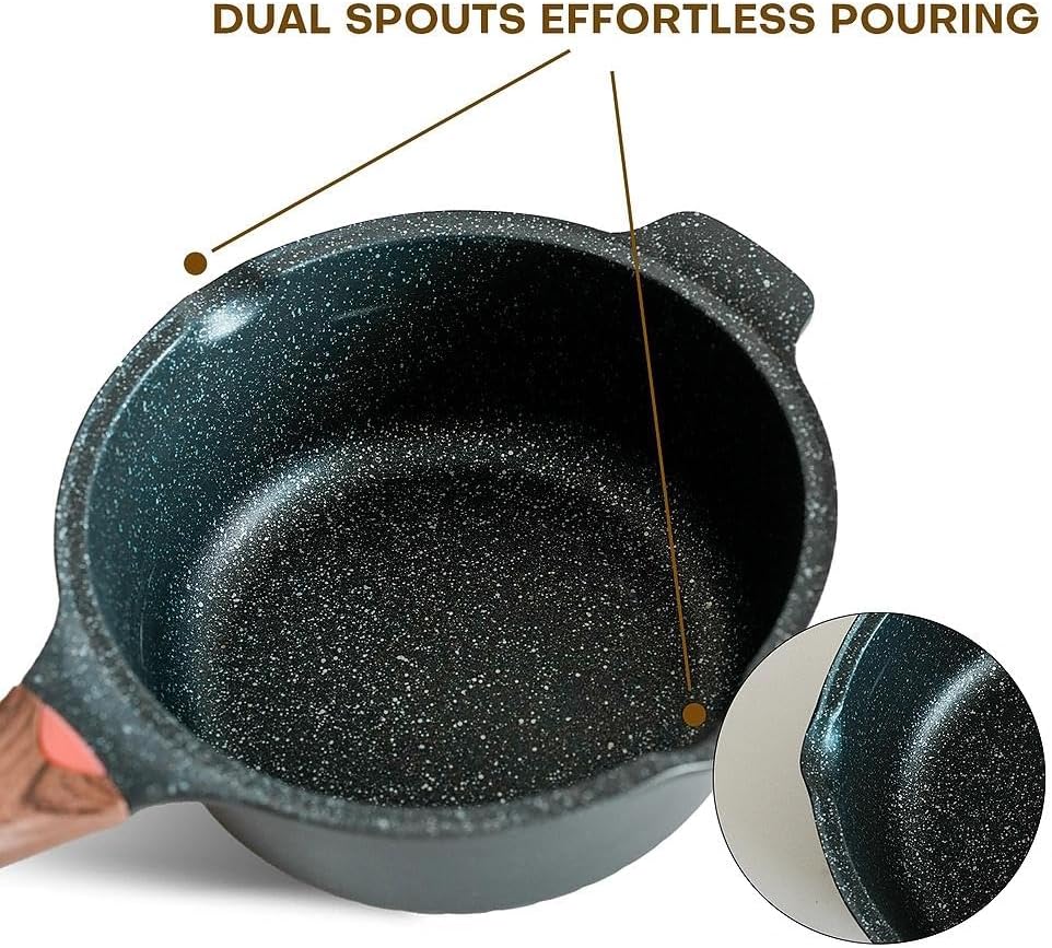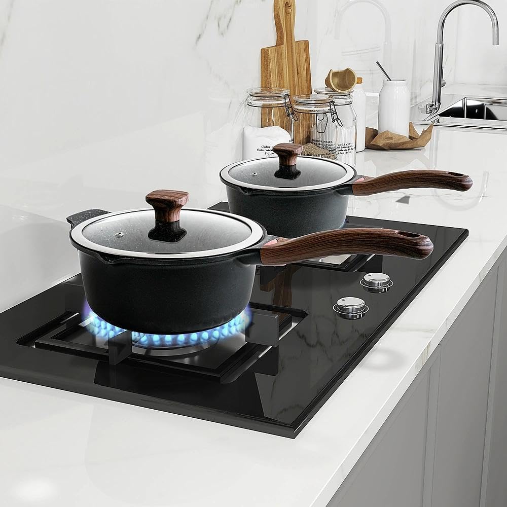 - 【2-Piece Cookware Set】Includes 3QT and 4QT saucepans with PFOA/PFOS-free granite coating. Designed to require less oil during cooking with reduced smoke production. Features easy-release coating and included lids, suitable for heating milk, preparing porridge or sauces.