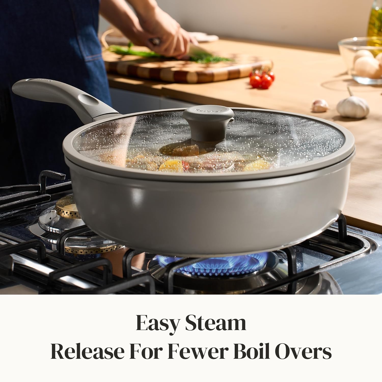 - FLAVOR-LOCKING GLASS LID: The tempered glass cover traps steam and moisture to enhance natural flavors while preventing messy splatters. Monitor cooking progress without lifting the lid, preserving heat integrity. Designed to fit snugly on this large skillet with lid for soups, braises, and frying