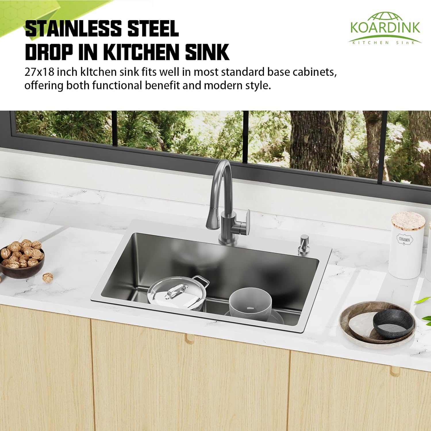 - Stainless Steel Sink: With exterior size-27"x18"x9", interior size 25"x16"x9", topmount kitchen&bar sink seamlessly transition between kitchen and bar environments, catering to different needs in both settings. Drop in kitchen&bar sink fits well in medium-sized kitchens and multi-purpose rooms, balancing function and space efficiency.