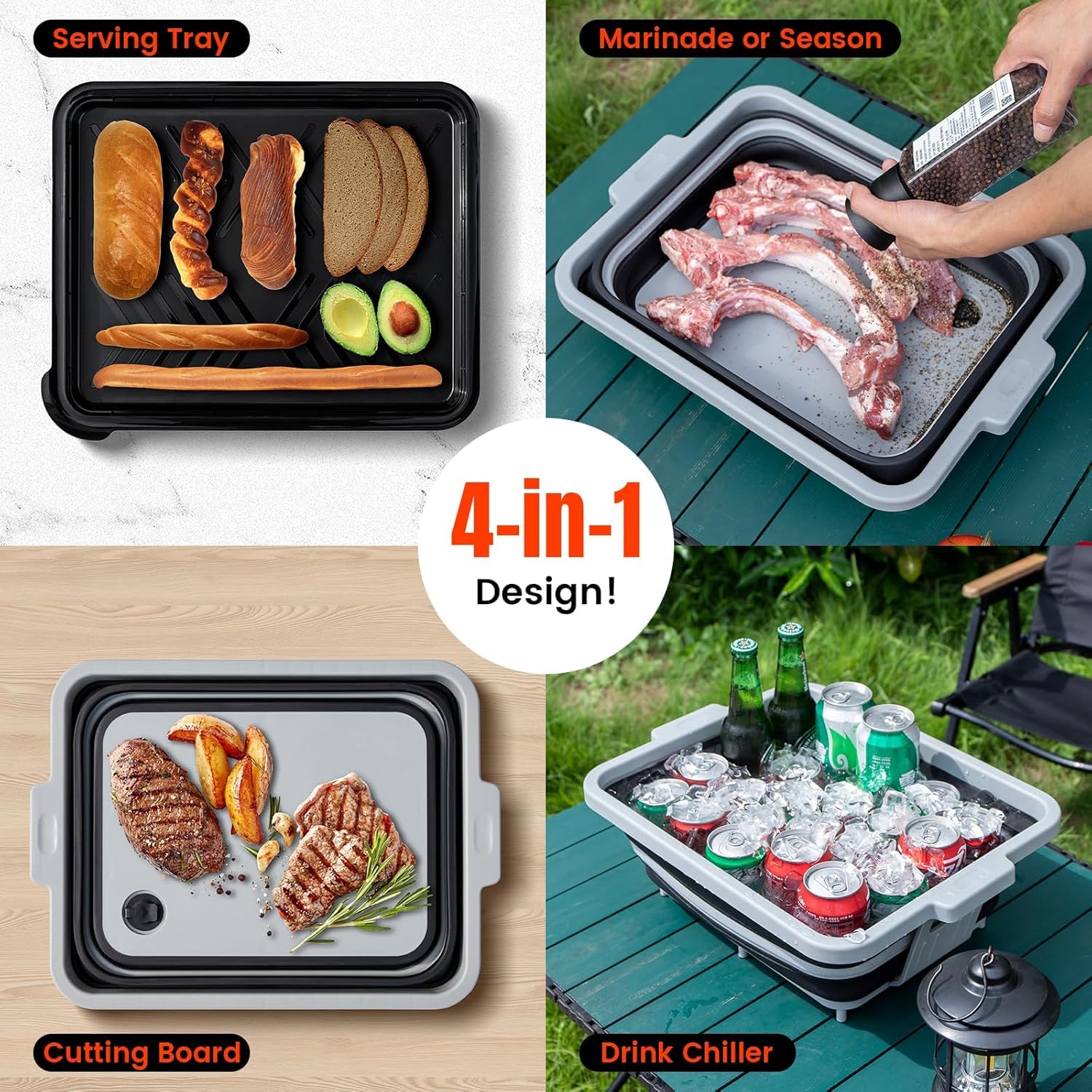 - 4-in-1 Versatile Prep Station — Functions as a collapsible food prep tub, marinating bucket, flip-over cutting board/serving tray and ice drink chiller. Perfect for BBQs, picnics, tailgates and camping — all-in-one convenience for faster meal prep and easy serving.