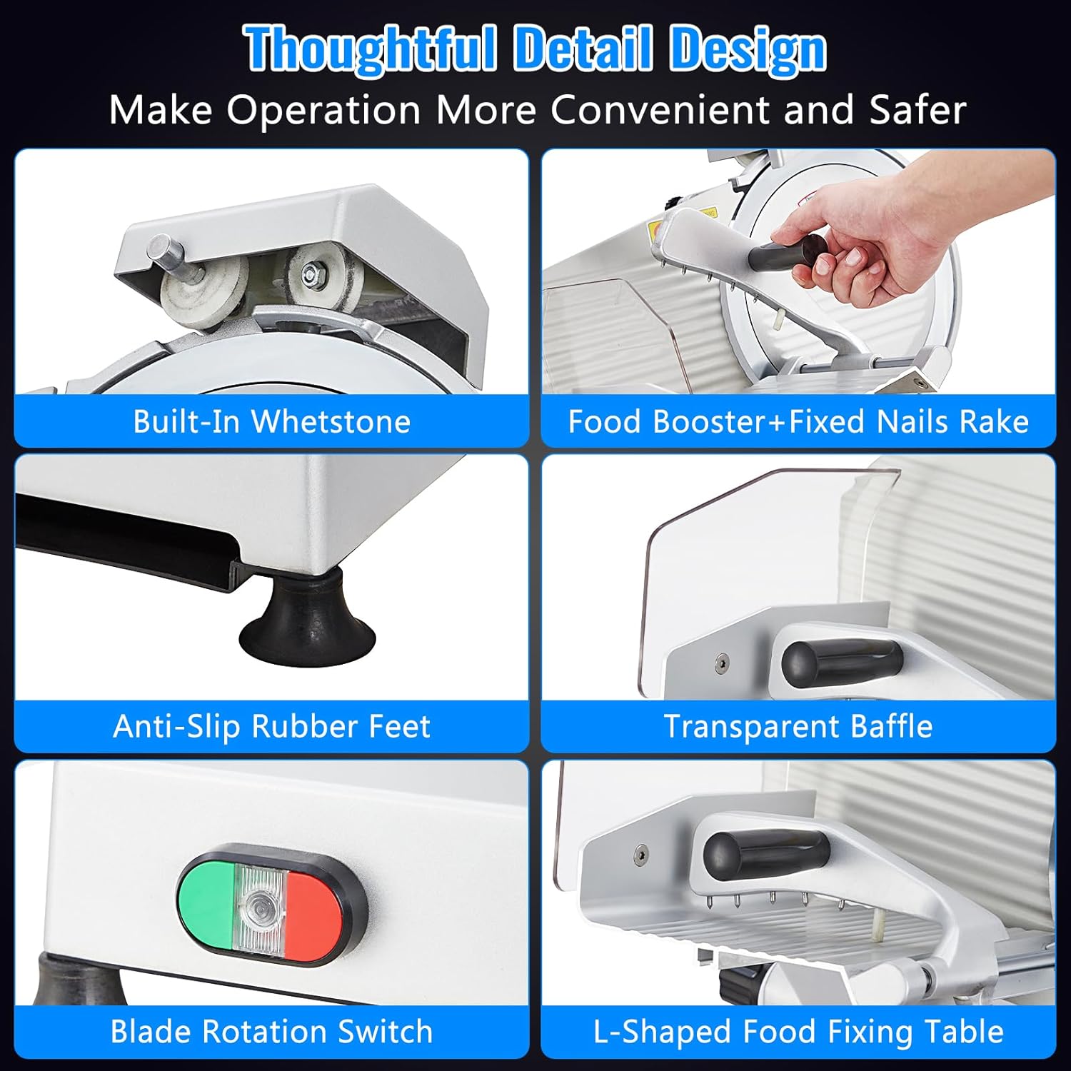 - 【Versatile Food Slicing】With its wide application range, this food slicer electric is perfect for slicing meat, cheese, bread, fruits, and vegetables—making it an excellent addition to any home kitchen, restaurant, deli, or commercial butcher shop.
