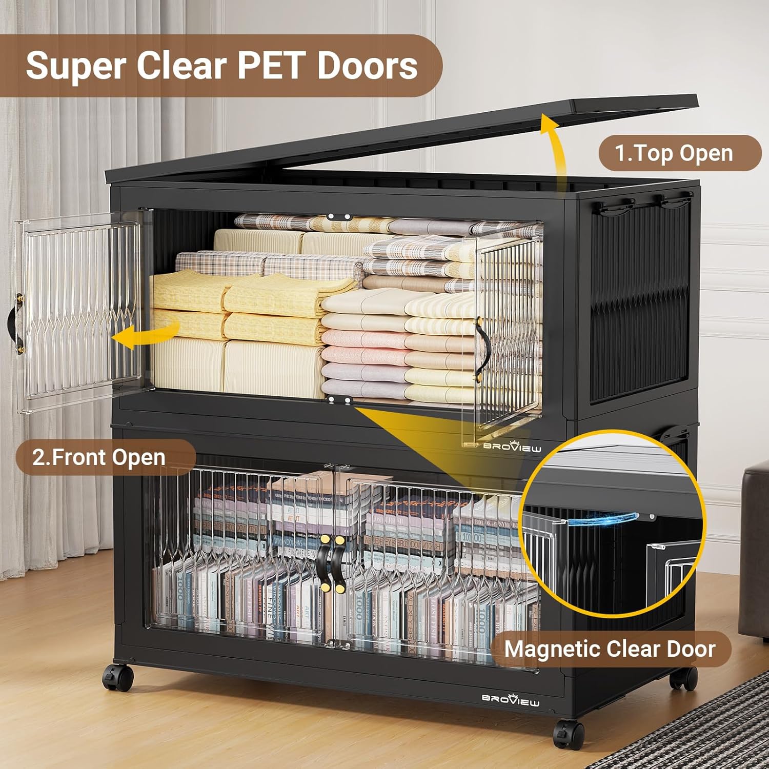 - 【Super Clear Magnetic Doors & 4x Wheeled】The large storage bins with clear PET doors provide two options: front doors opening or top lid opening. The clear PET door can be easily seen through and with a magnetic device. The 4x 360-degree rotating wheels all have fixed functions and can be easily moved by releasing the valve, making them friendly to the elderly.