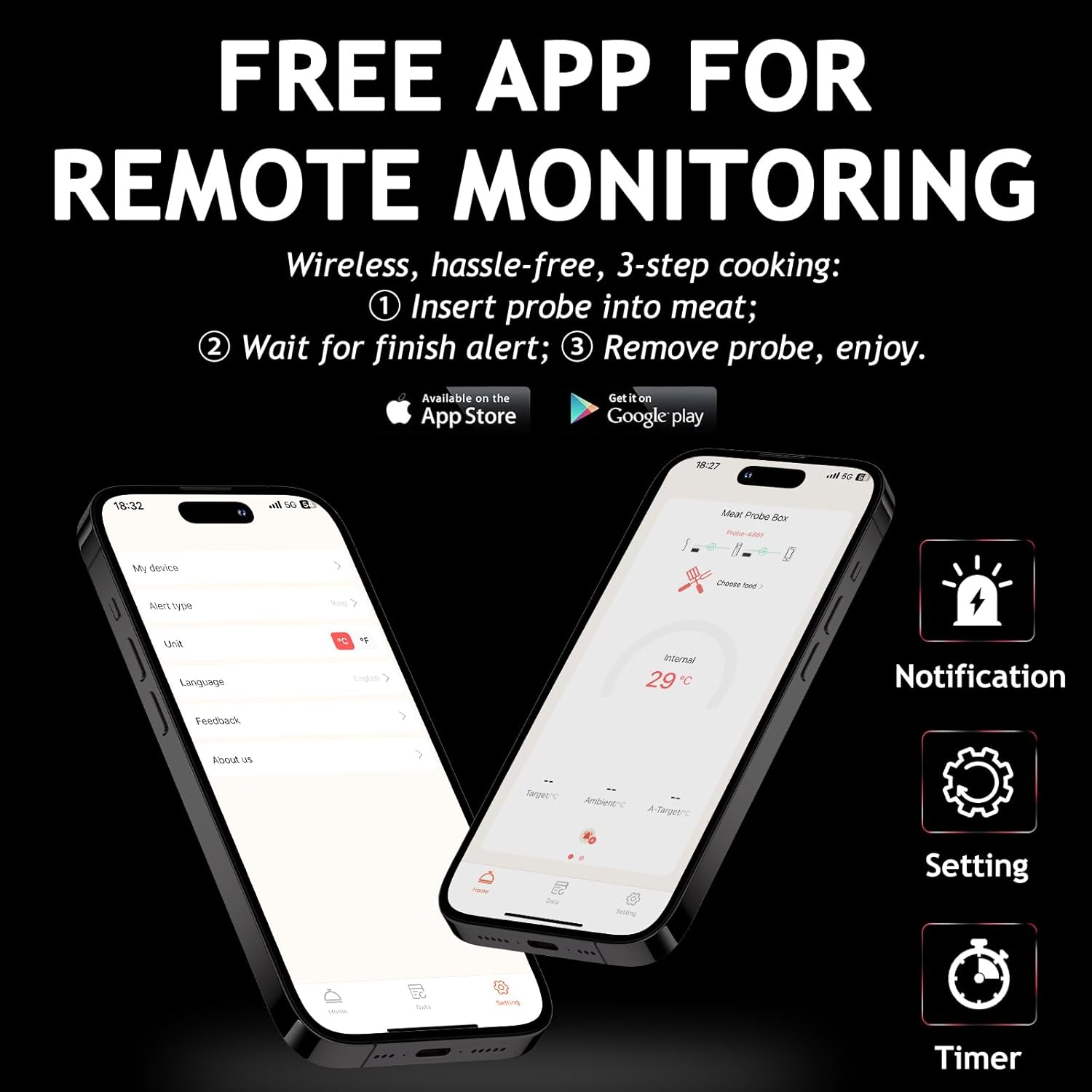 - 🔗 100% Wire-Free Meat Thermometer Probe with Safe Needle: No wires to get tangled or limit your cooking. Our food thermometer features a fully wireless probe with food-grade and 5.5mm ultra-thin stainless steel needle—easy to insert.