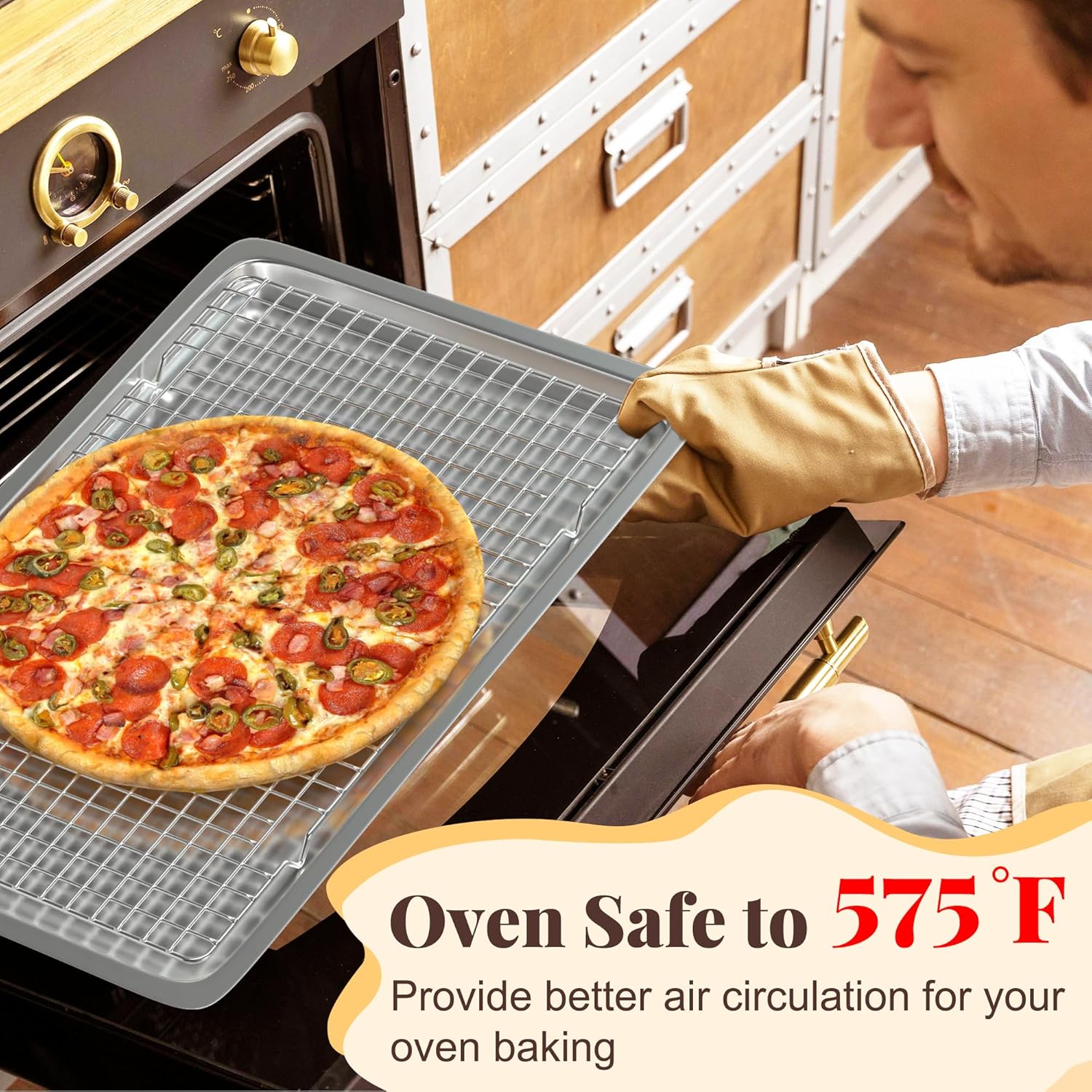 - OVEN & DISHWASHER SAFE: This wire rack for baking sheet has excellent heat resistance up to 575℉ oven baking, you can safely use it for roast, grill, smoke, dry. Besides, you can safely put the bread cooling rack into the dishwasher for cleaning. If need to hand wash, just soak it in mild soapy water and the stains will be easily removed