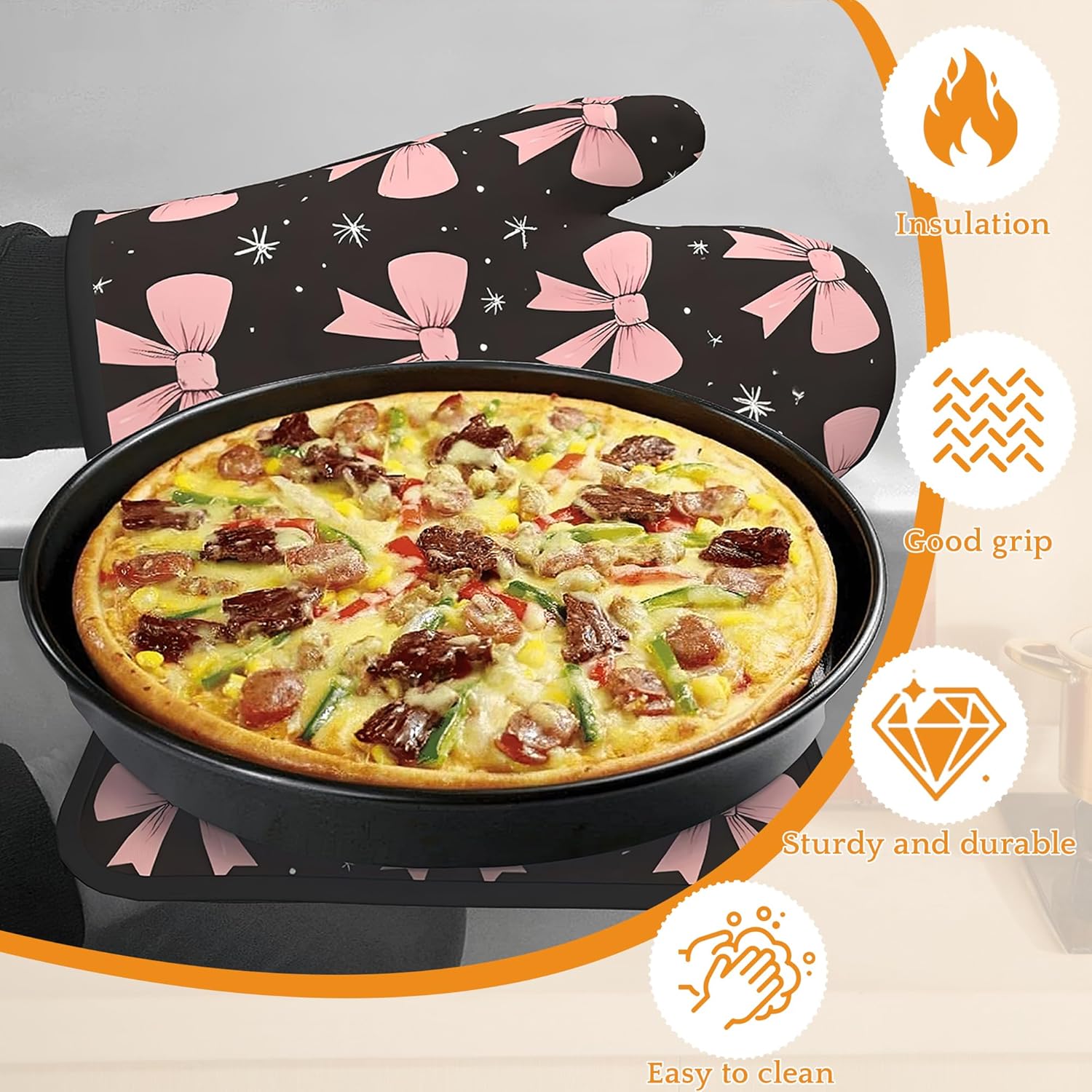Cute Pink Bow Oven Mitts and Pot Holders,Heat Resistant Oven Mitts Gloves and Pot Holder for Home Kitchen Decorations Cooking Baking BBQ Gifts,Set of 4